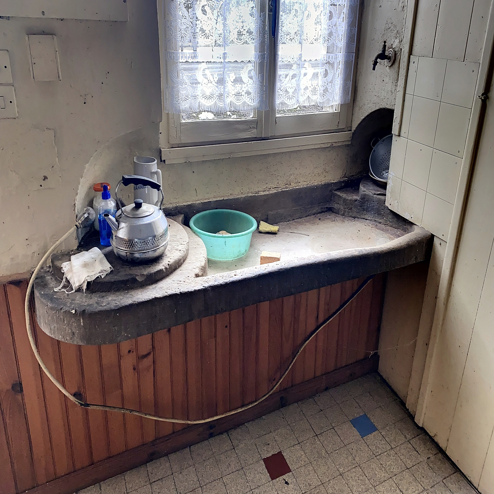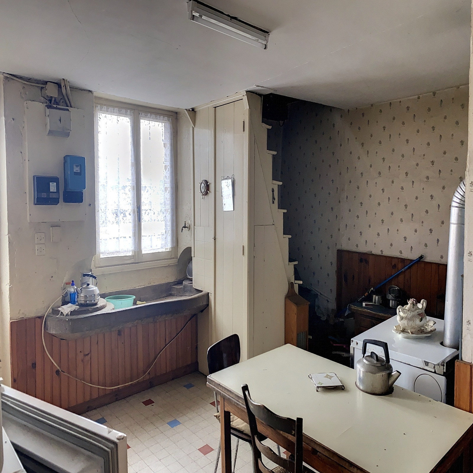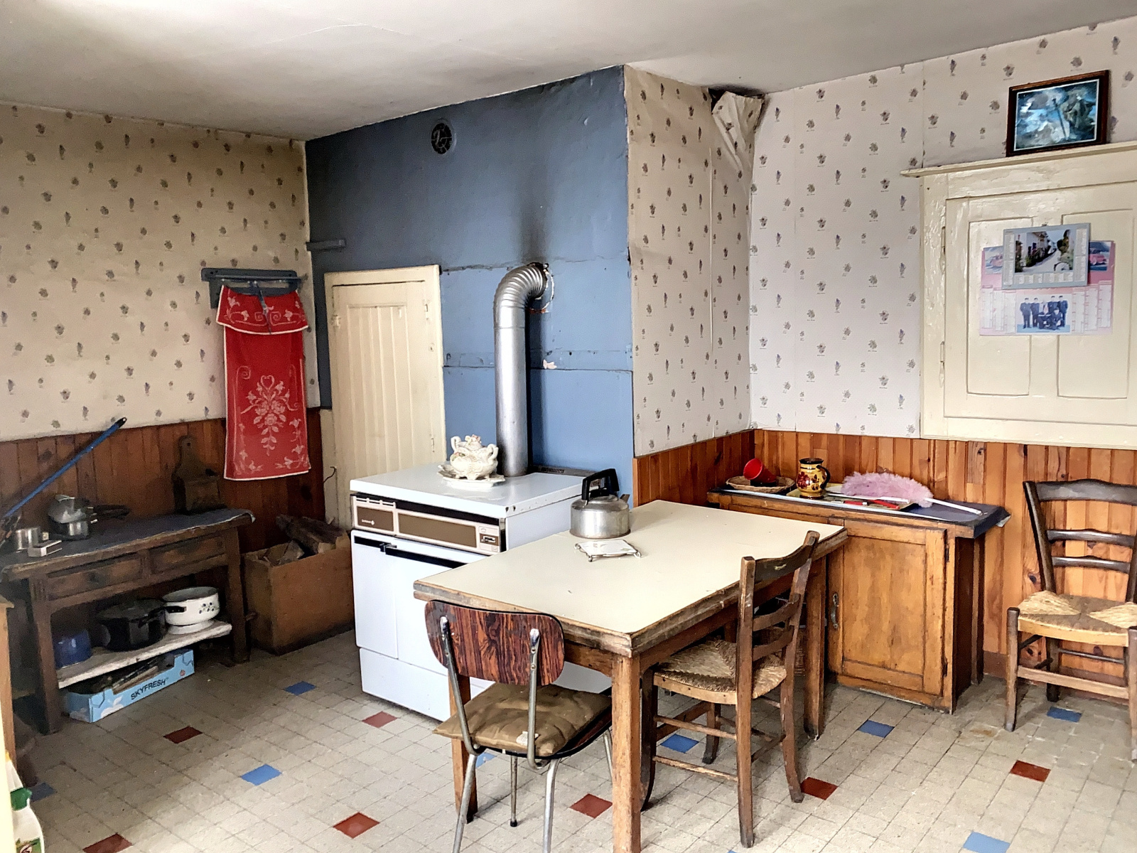 Au rez-de-chaussée :entrée sur cuisine avec fumoir et cuisinière à bois (env 15 m²), salle à manger (env 22 m²) avec poêle à bois, salle de bains, wc, cellier (env 7m²).
