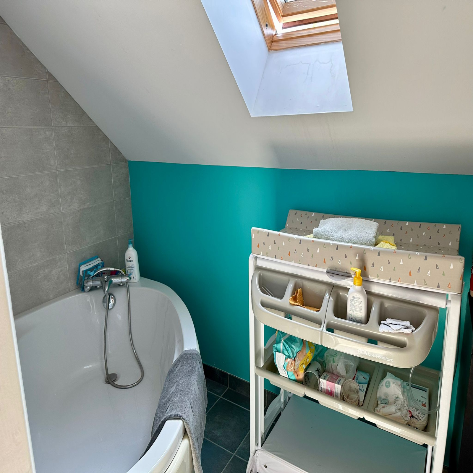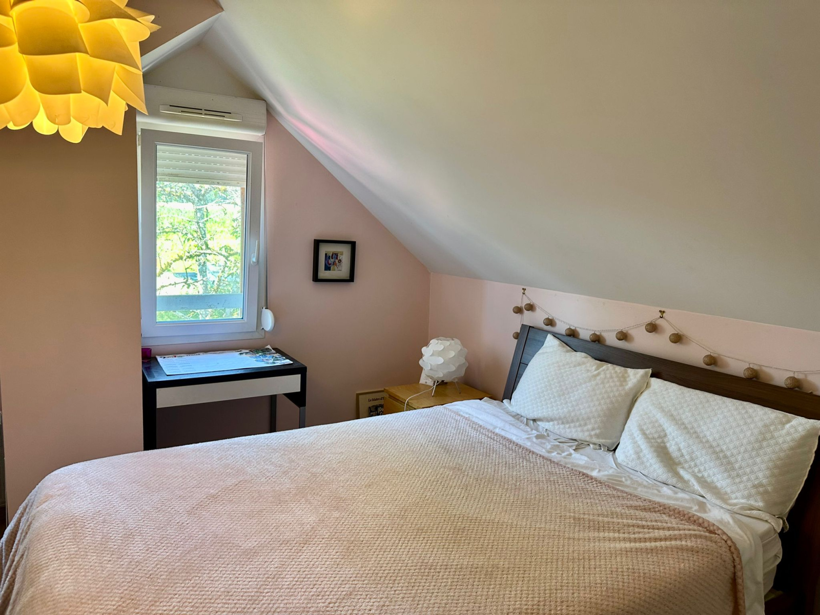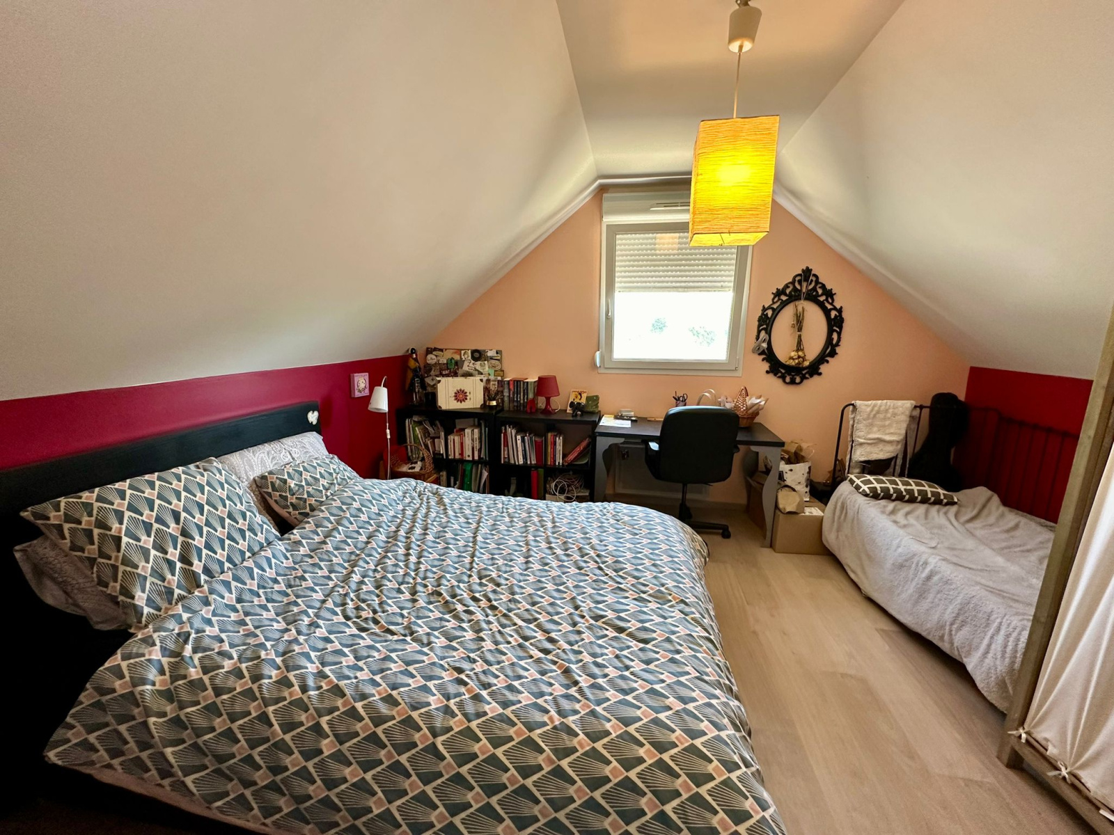 A l'étage : 2 chambres mansardés (9 et 10 m2 env), salle de bains mansardée (3 m2 env), w.c.