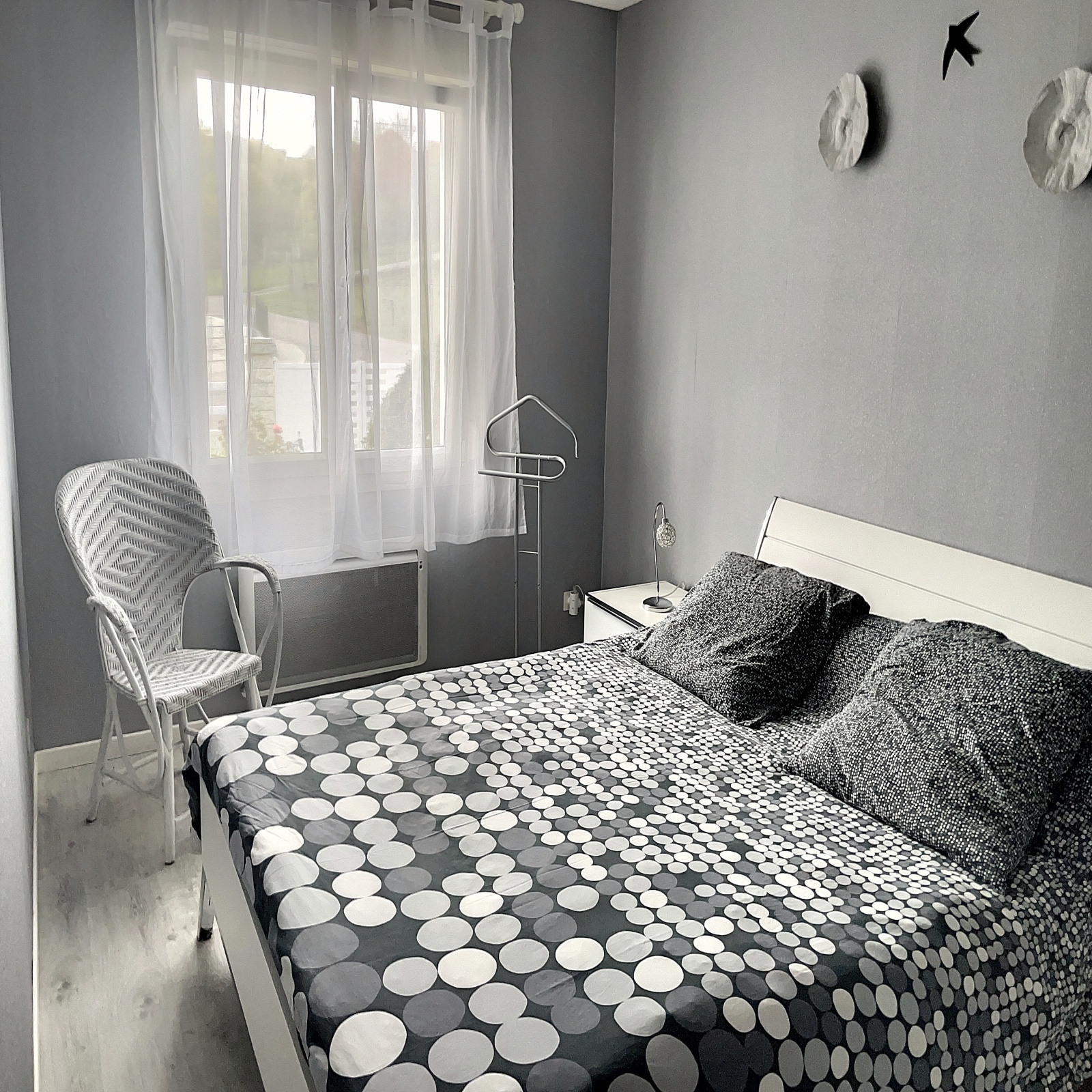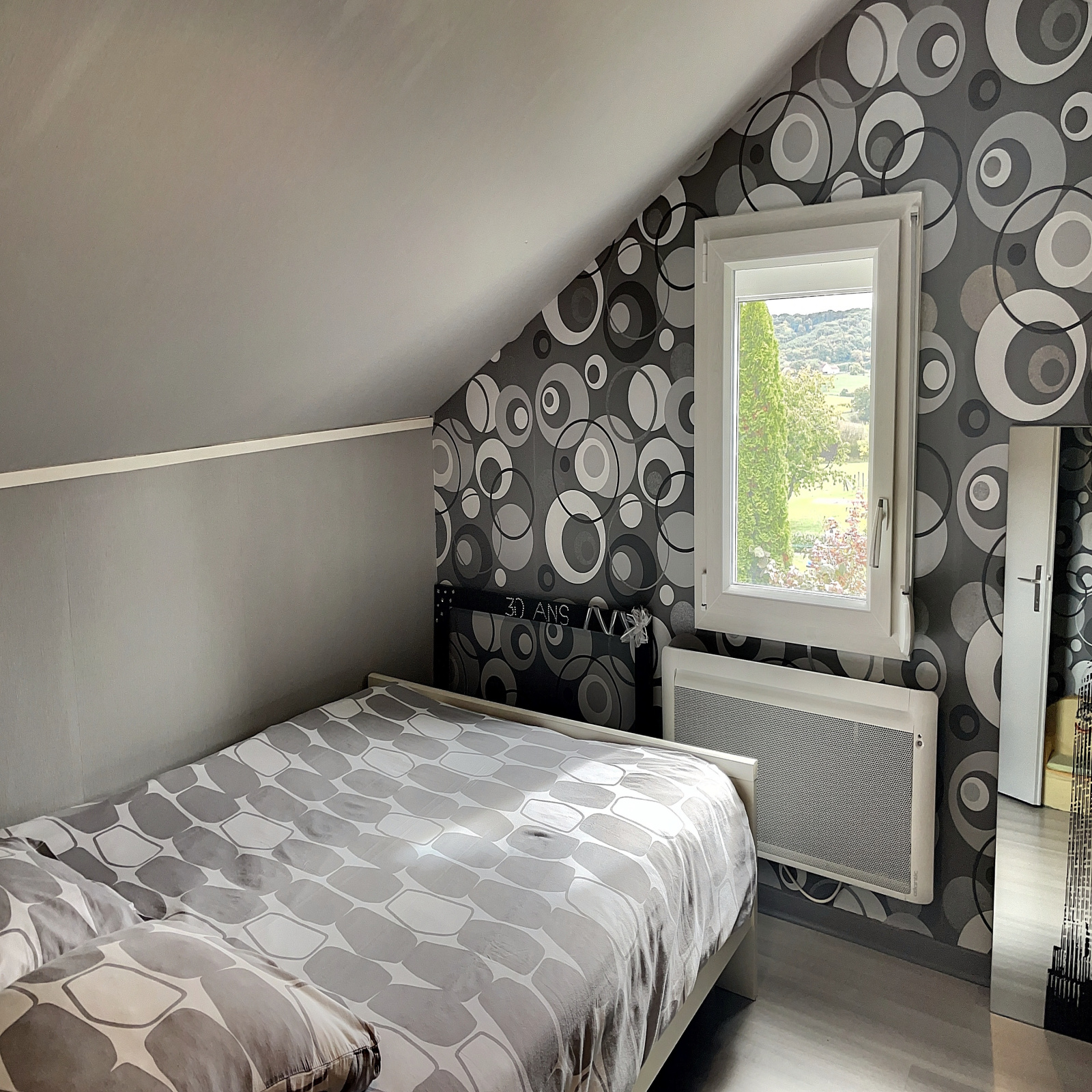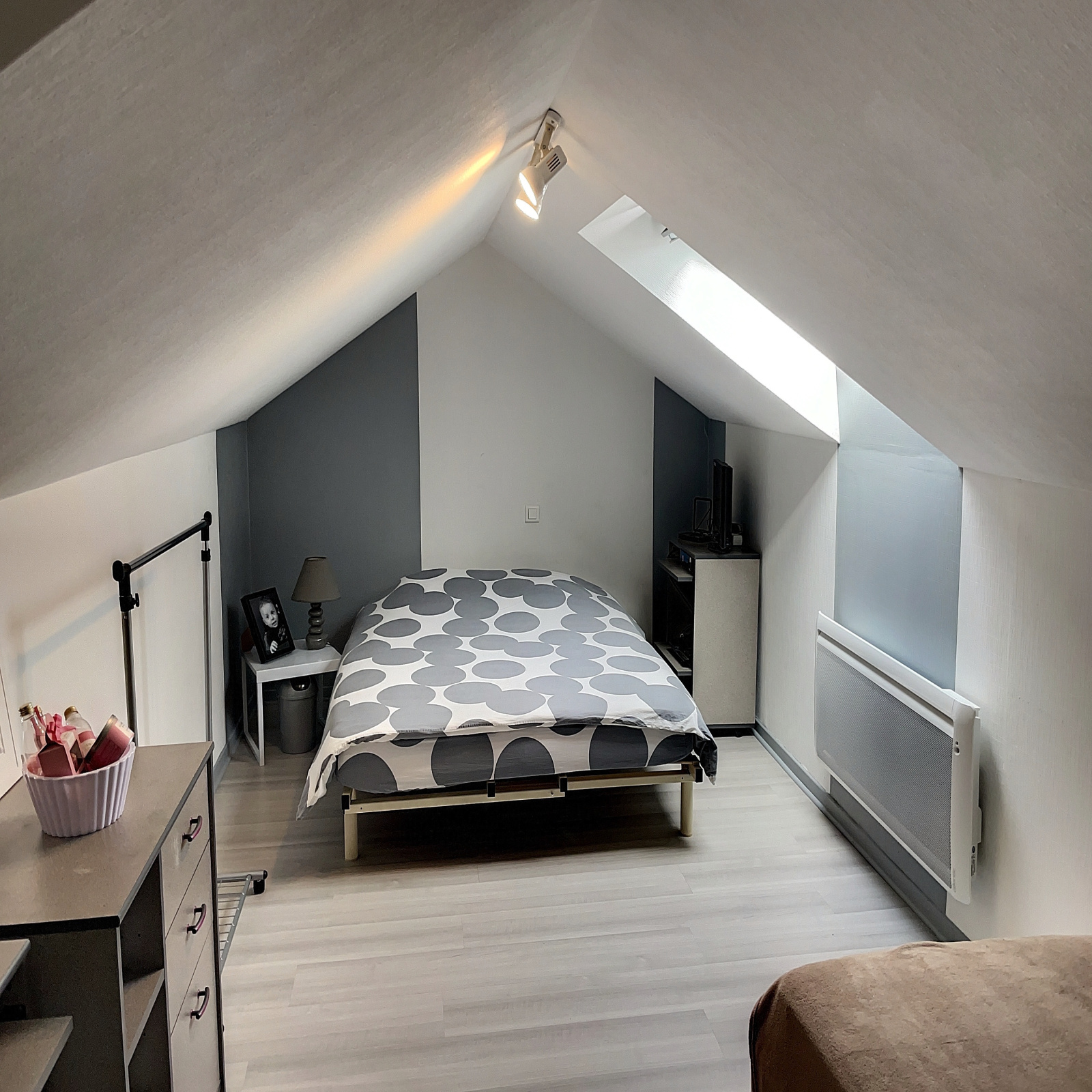 A l'étage : petit palier, 2 chambres mansardées.