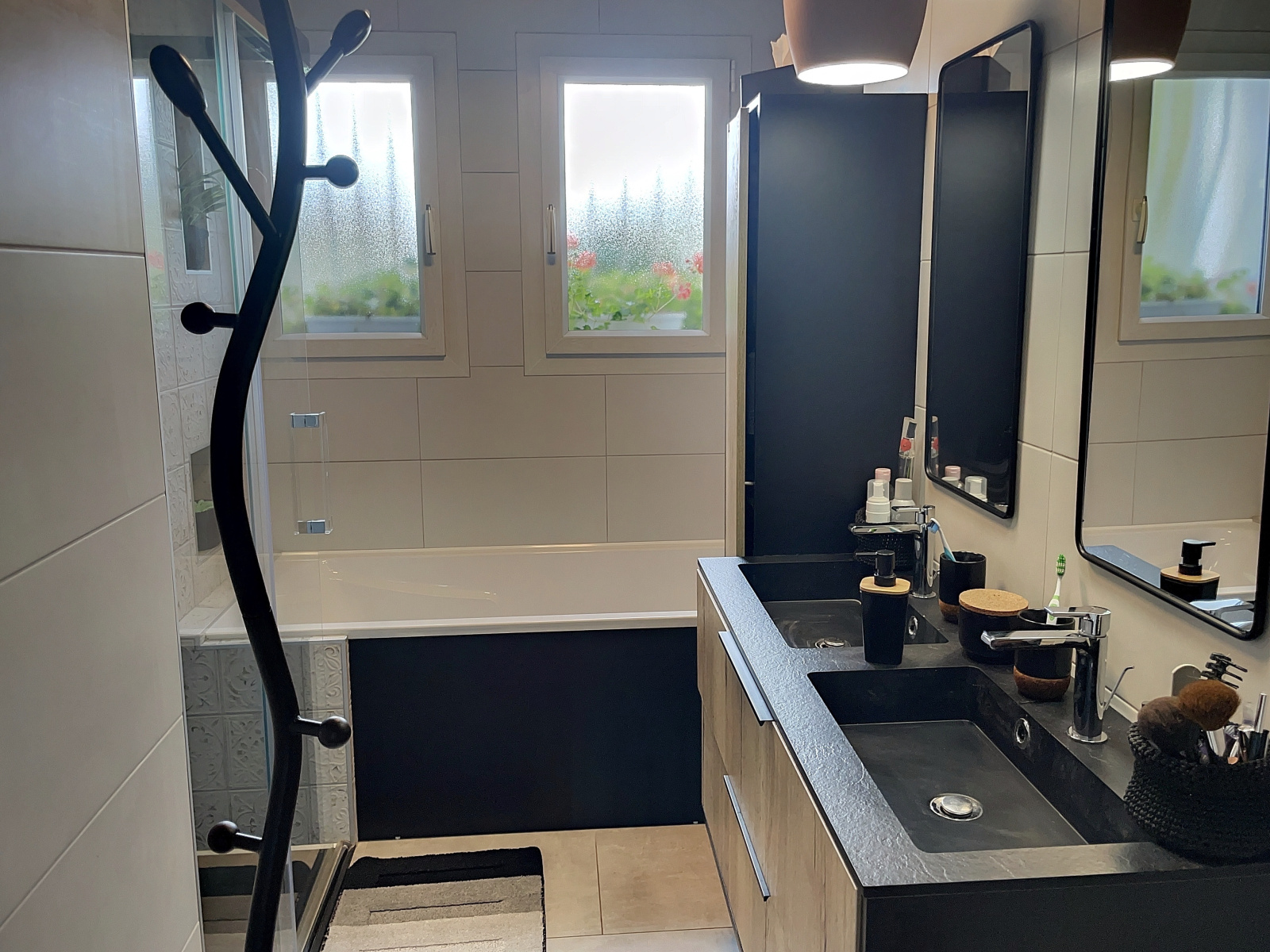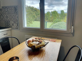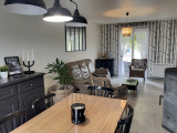 Au rez-de-chaussée : entrée sur dégagement (8 m2 env), cuisine équipée (11 m2 env) ouverte sur salle à manger / salon (25 m2 env) avec poêle à bois et accès terrasse, une chambre (12 m2 env), une chambre (11 m2 env), salle de bains (baignoire + douche, 6 m2 env), wc.