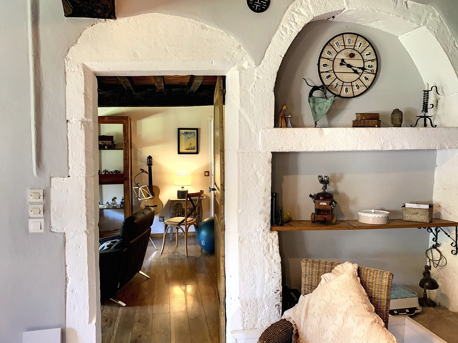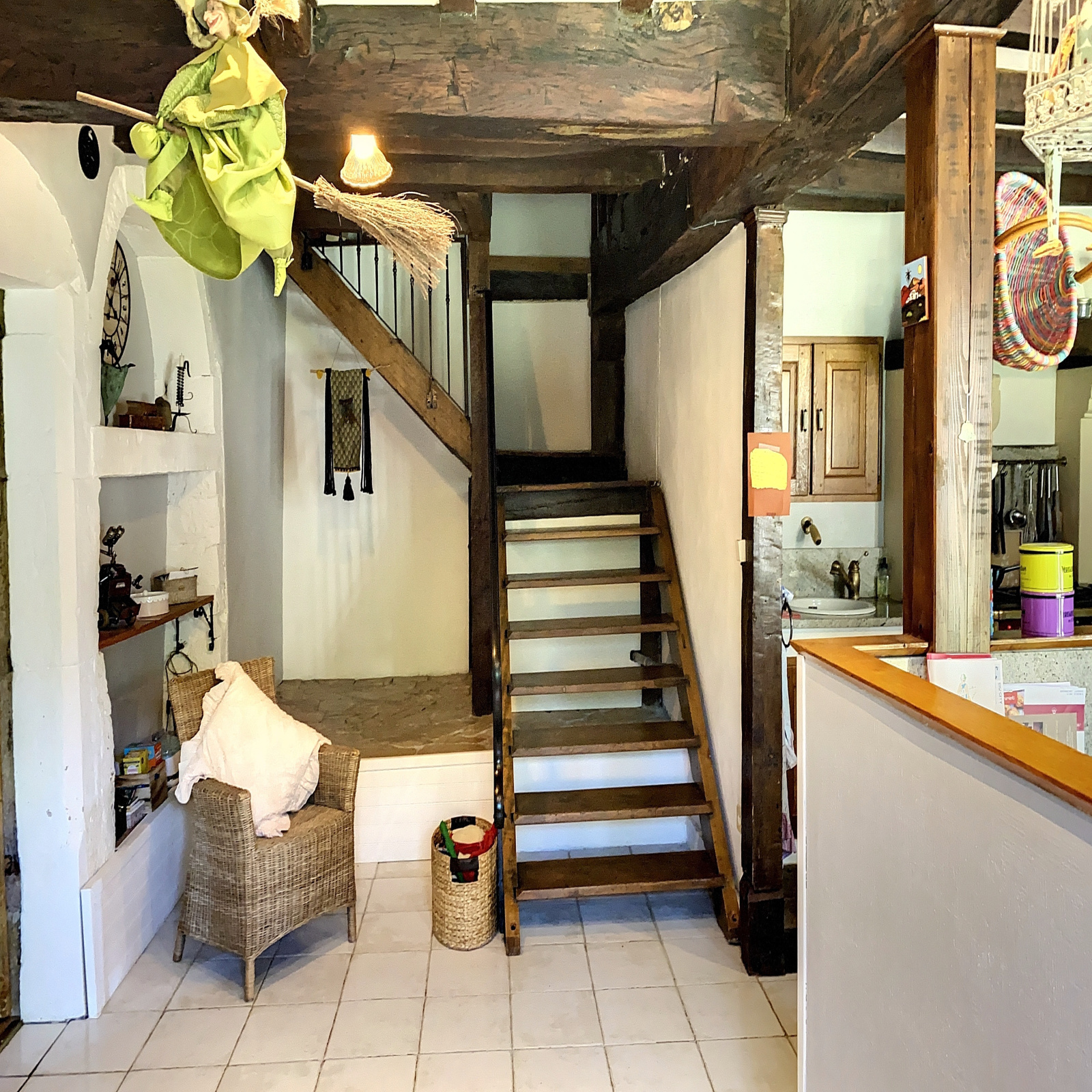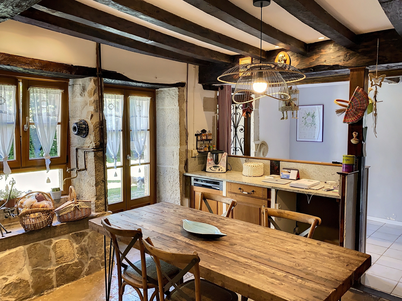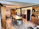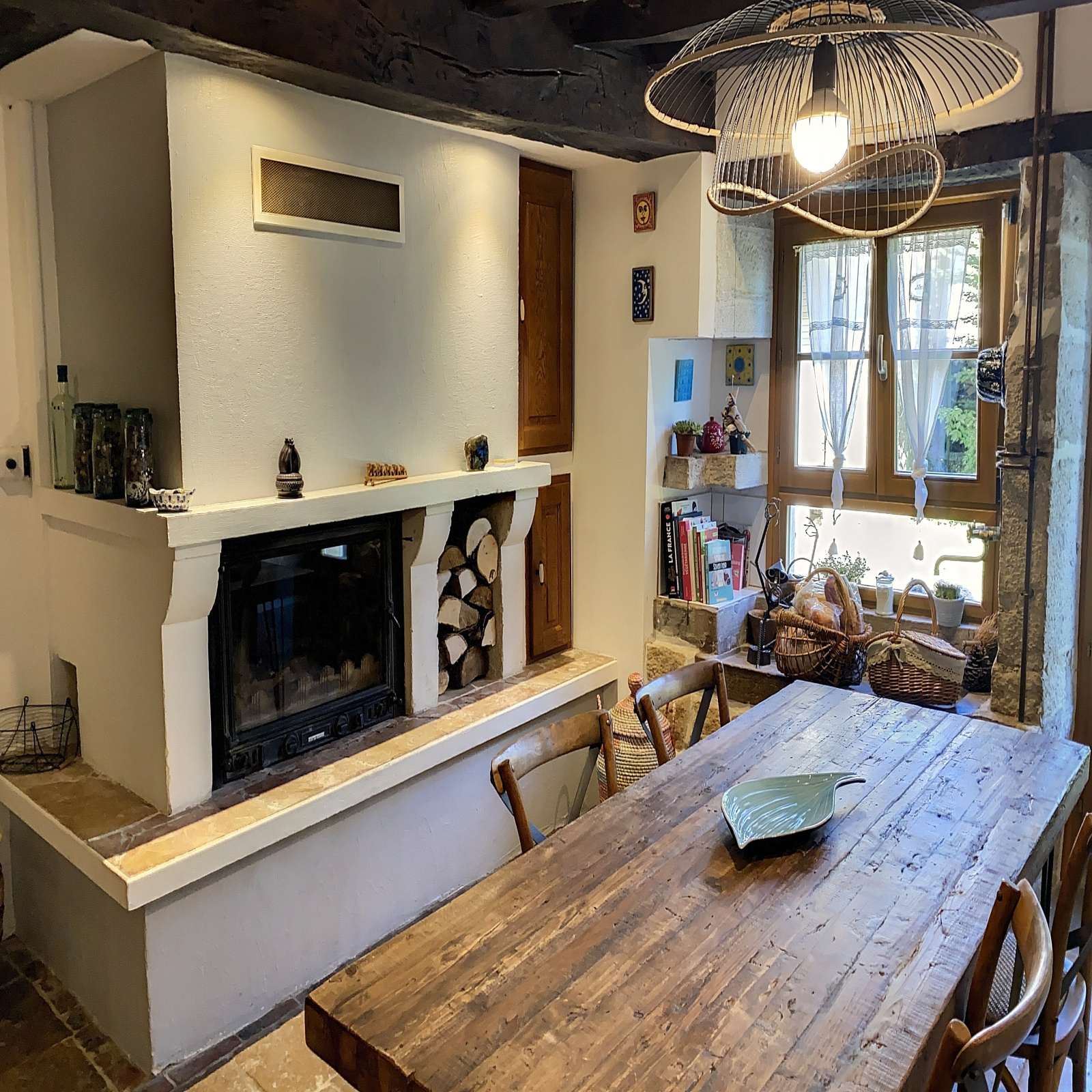 Au rez-de-chaussée : entrée sur cuisine aménagée avec cheminée insert, salle à manger / salon, salon avec rangements, une chambre, salle de bains, wc, cellier.