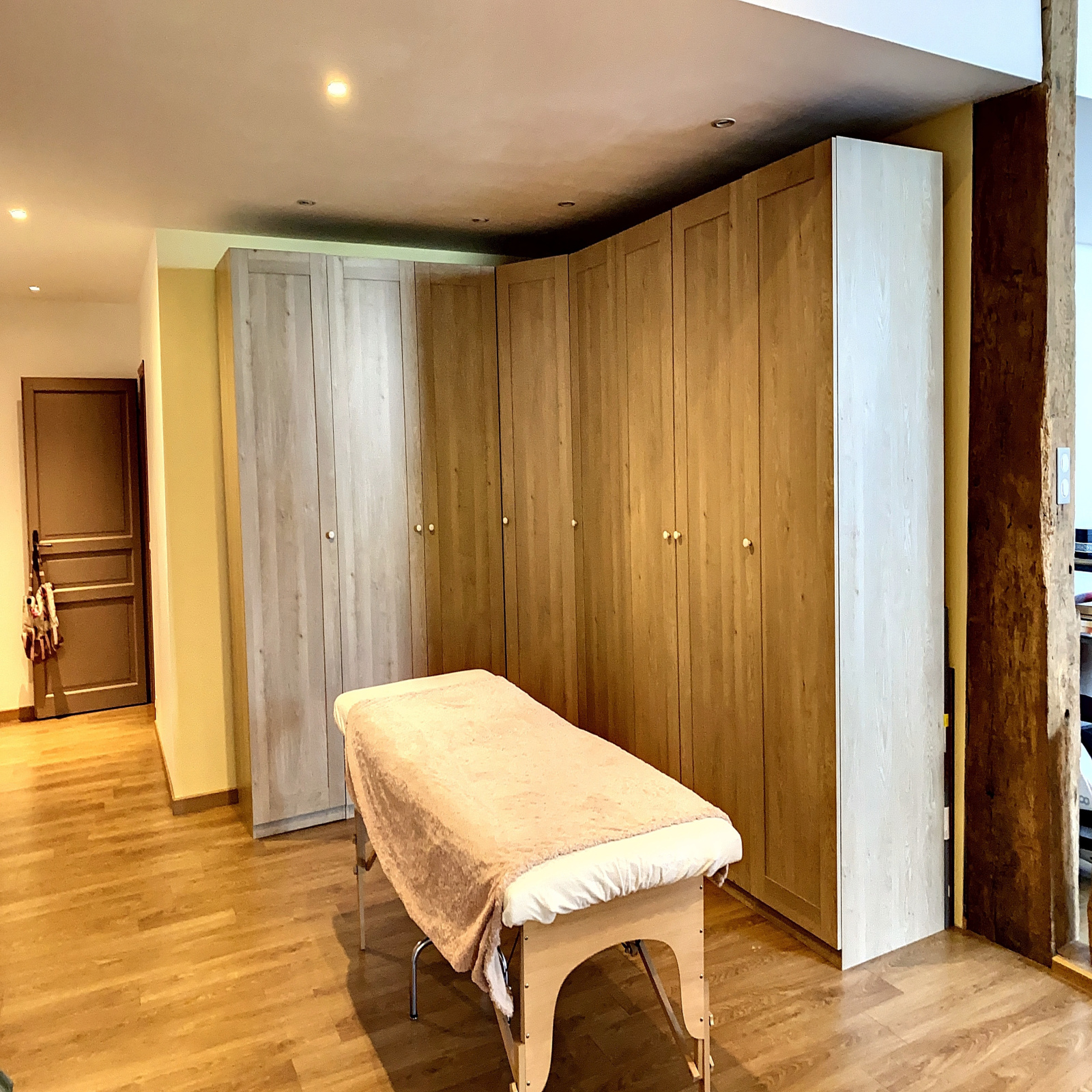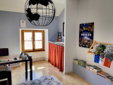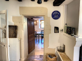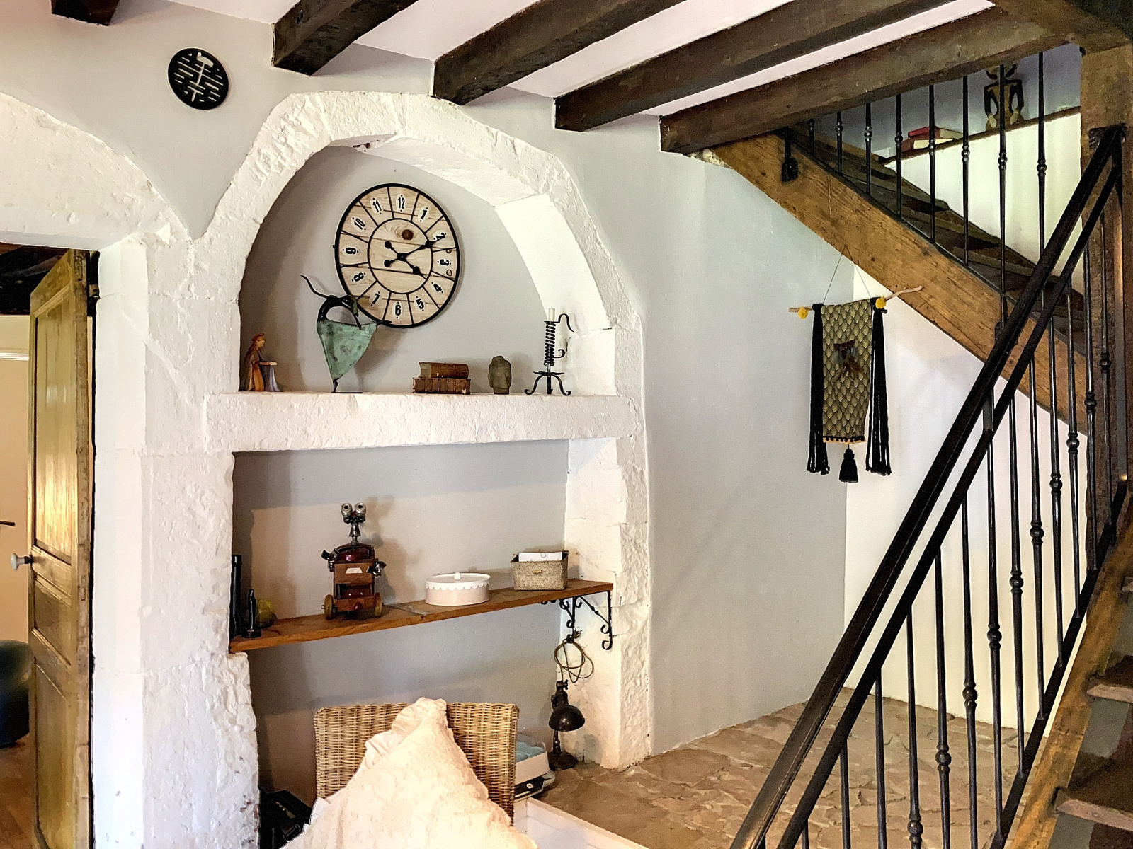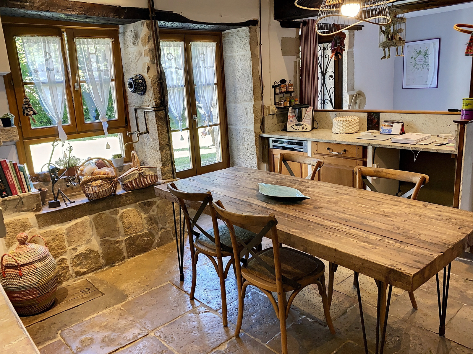 Au rez-de-chaussée : entrée sur cuisine aménagée avec cheminée insert, salle à manger / salon, salon avec rangements, une chambre, salle de bains, wc, cellier.