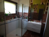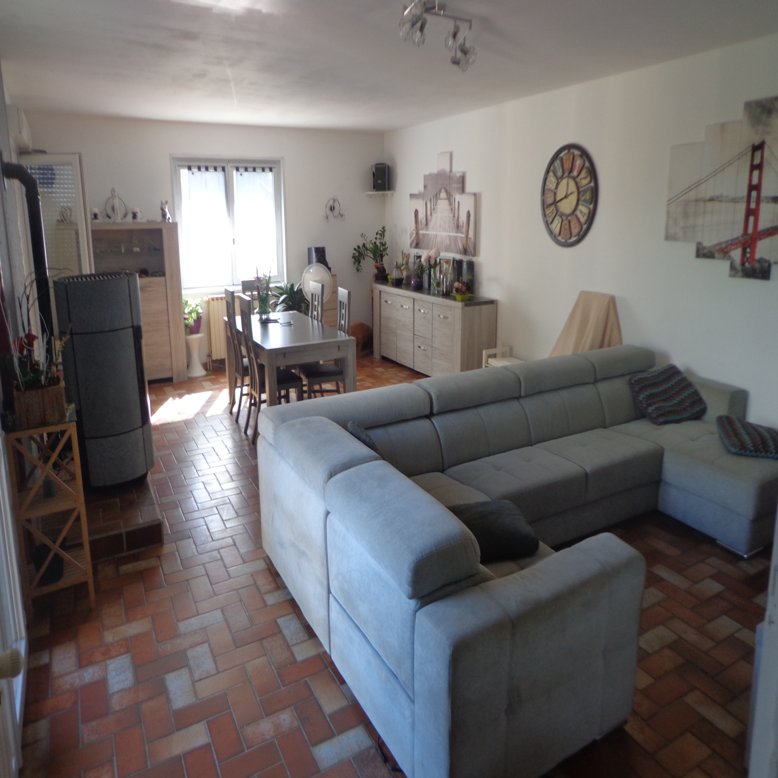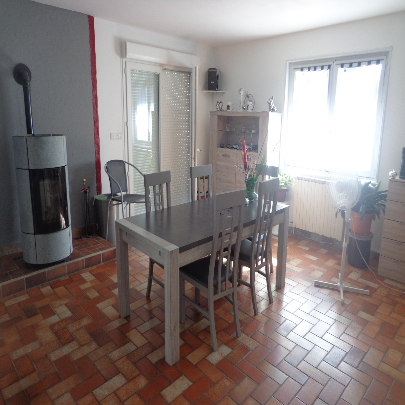 Au rez-de-chaussée : entrée avec placard (13 m² env), cuisine semi-équipée (12 m² env), salle à manger / salon avec poêle à pellets (41 m² env), 3 chambres (12, 13 et 13 m² env) dont une avec placard, salle d'eau (6 m² env), wc.