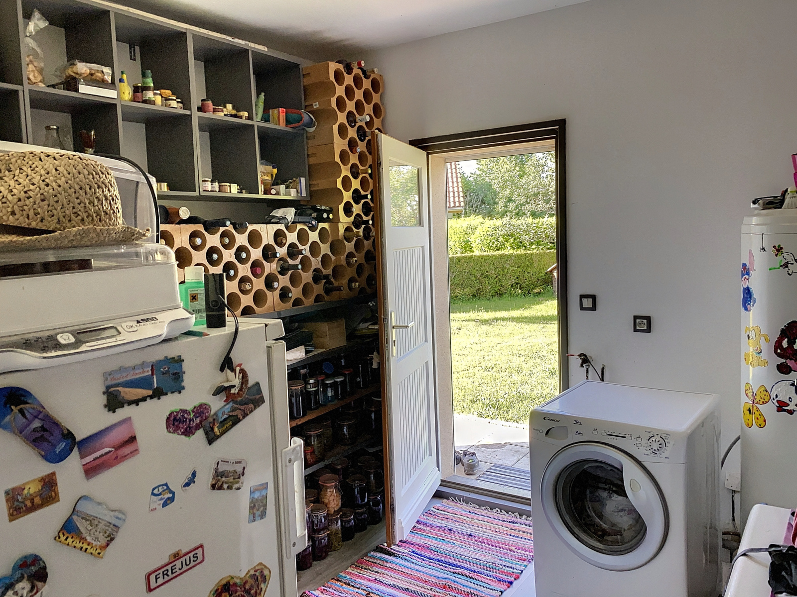 Au rez-de-chaussée : entrée avec rangements, cuisine équipée ouverte sur salle à manger / salon avec cheminée, 2 chambres dont une avec placard, salle de bains, wc, cellier / buanderie.