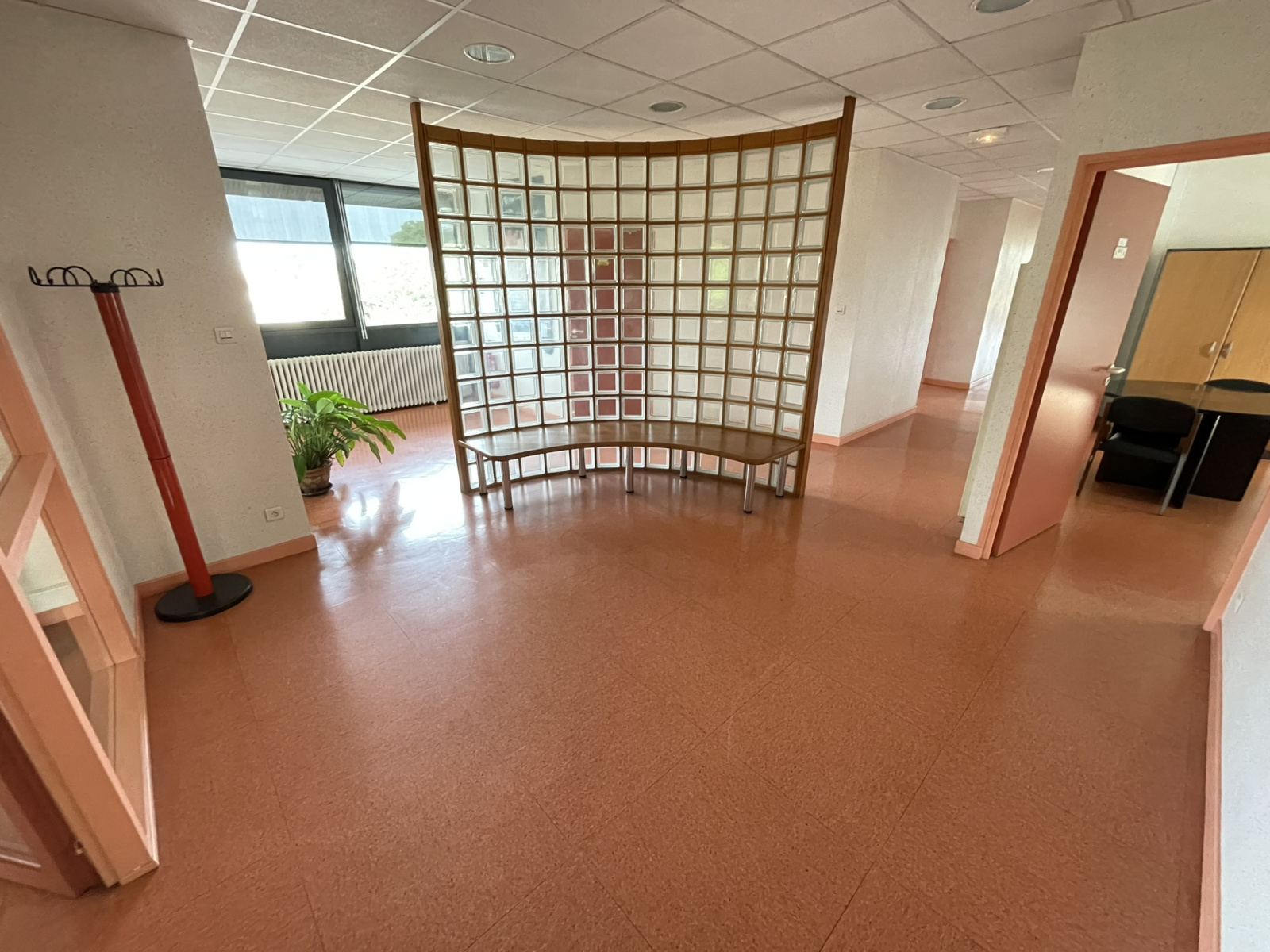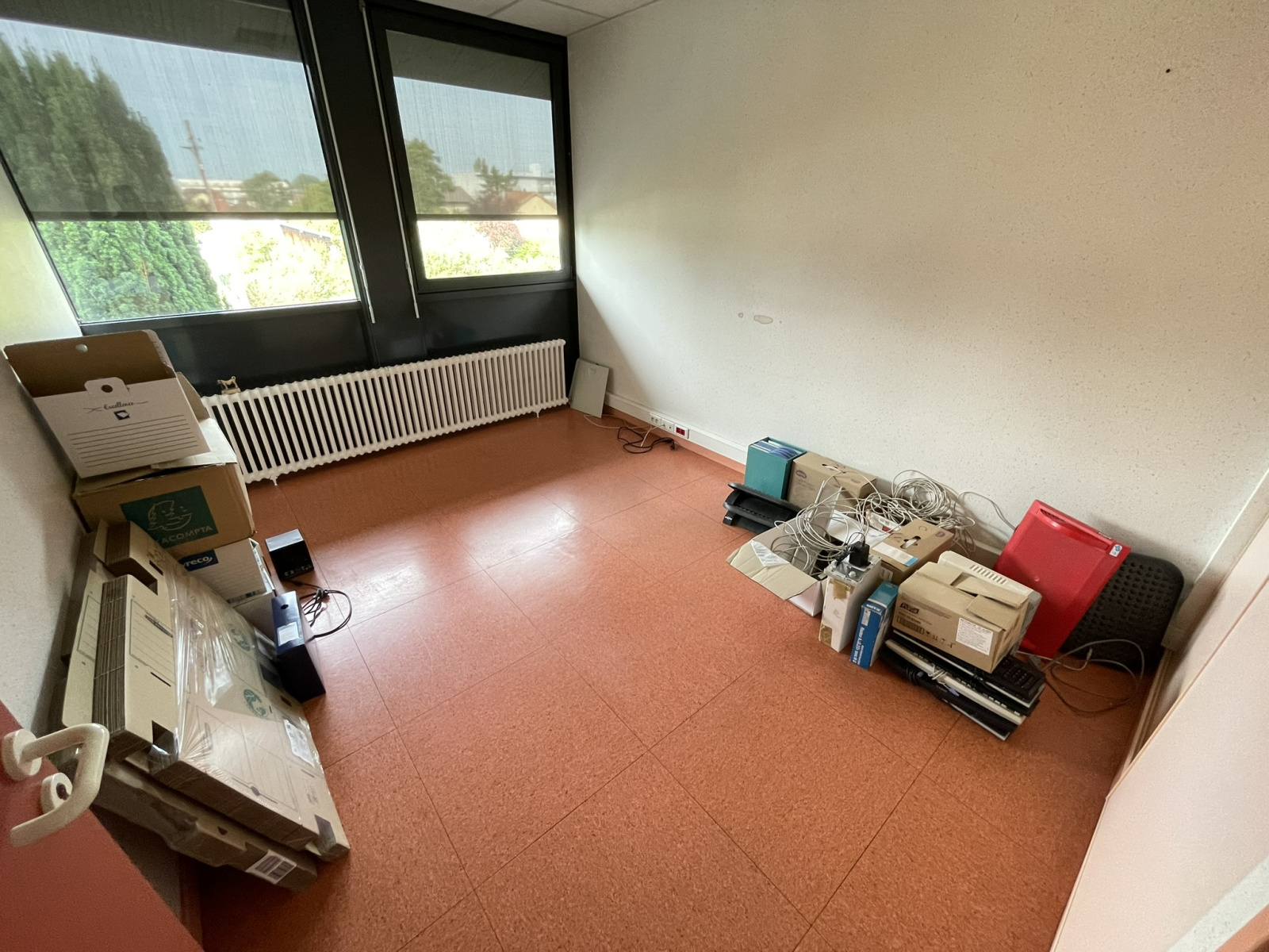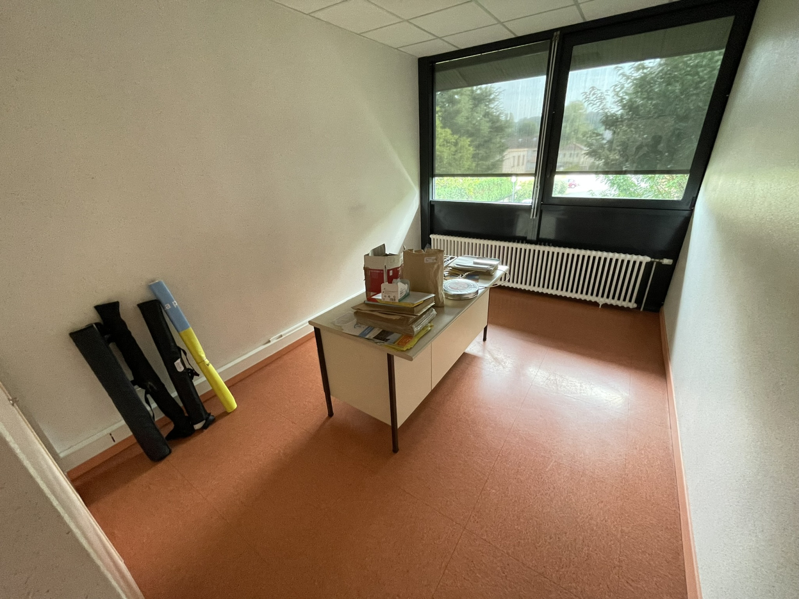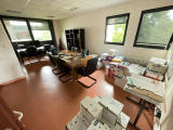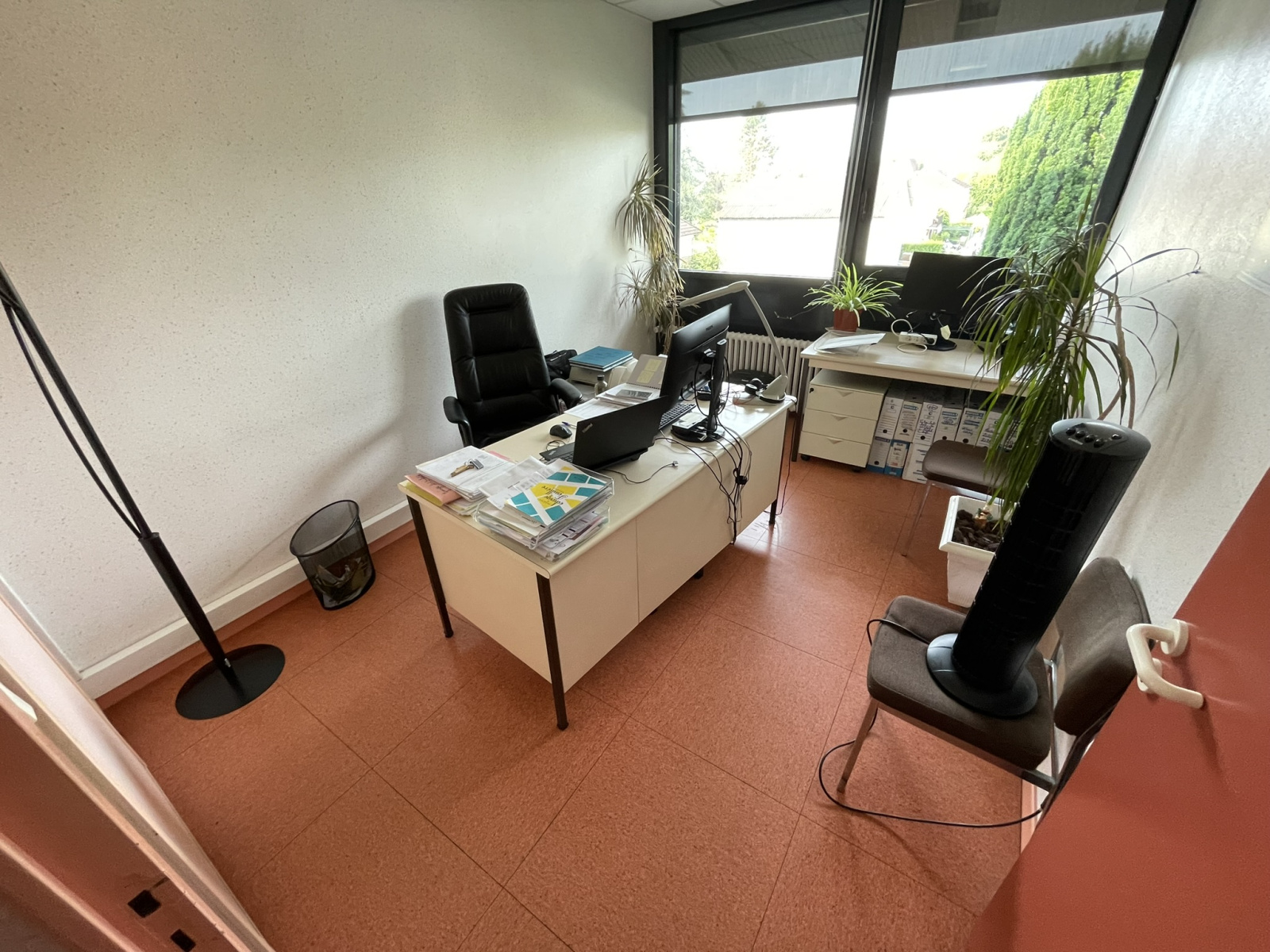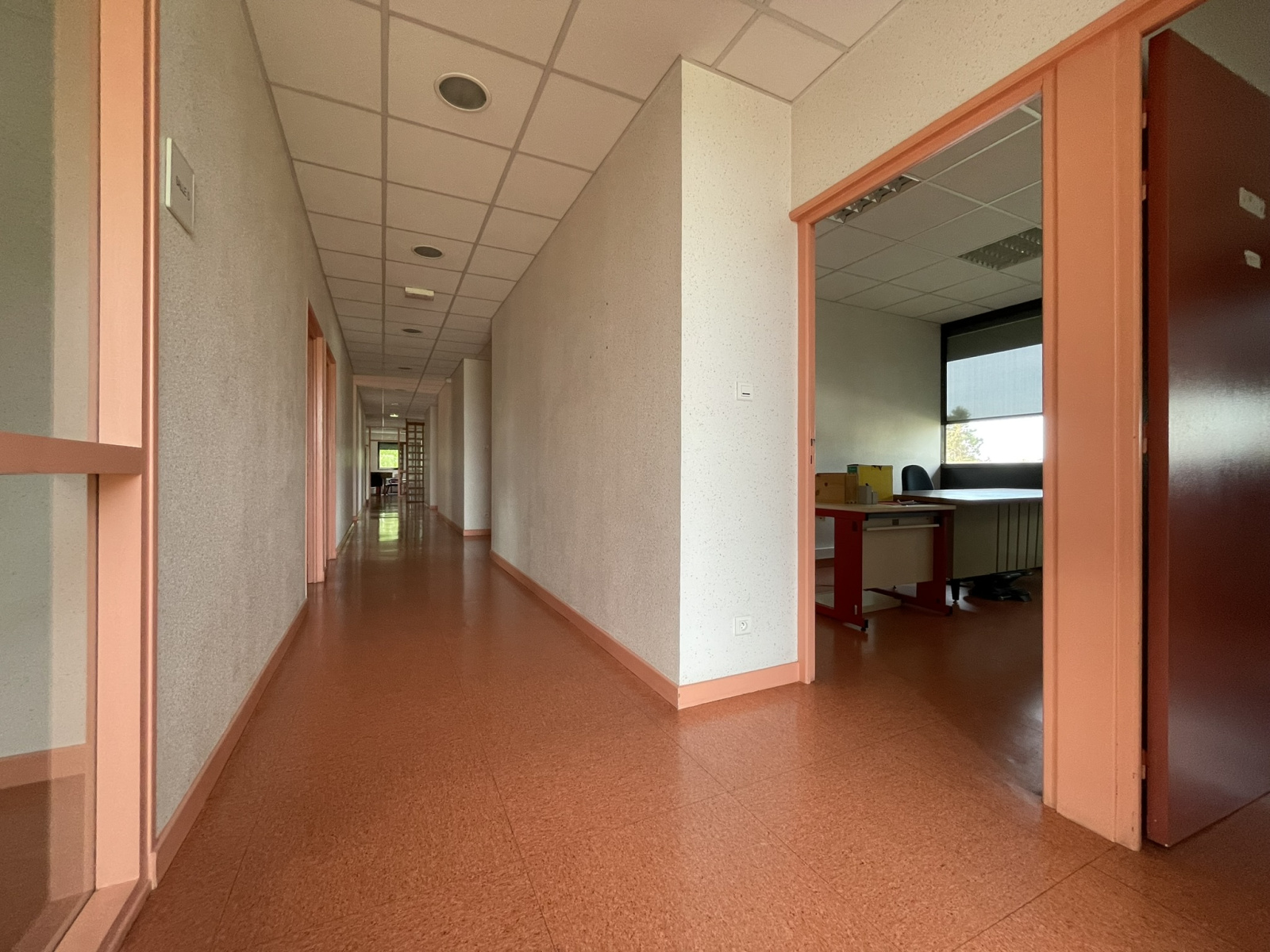 A l'étage : hall (56 m2 env), grand bureau (30 m2 env), 2 bureaux (15 et 20 m2 env), une pièce d'archivage (35 m2 env), local technique informatique avec climatisation, 8 bureaux avec placards (12-13 m2 env), cuisine (15 m2 env), une pièce avec sortie de secours (21 m2 env), sanitaires.