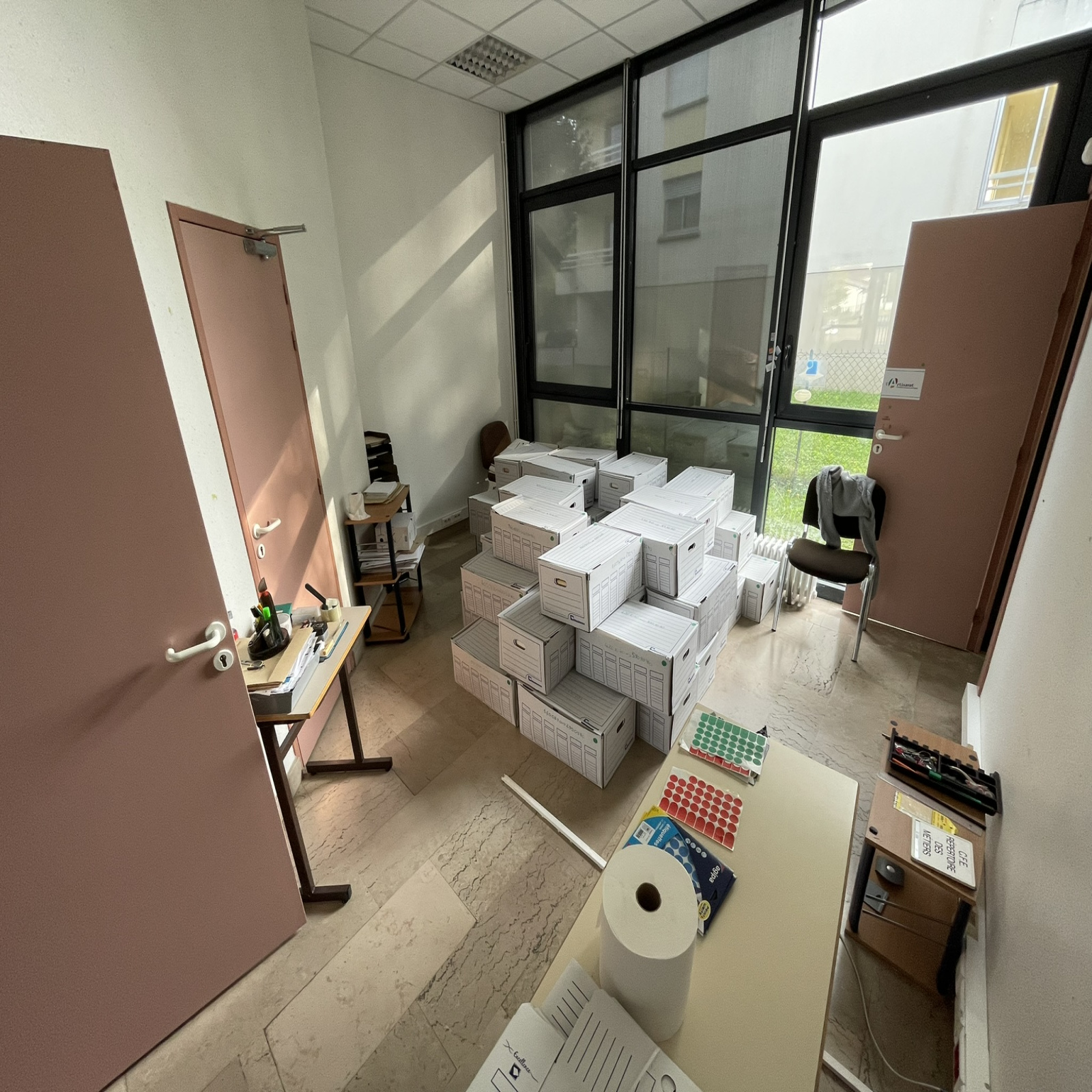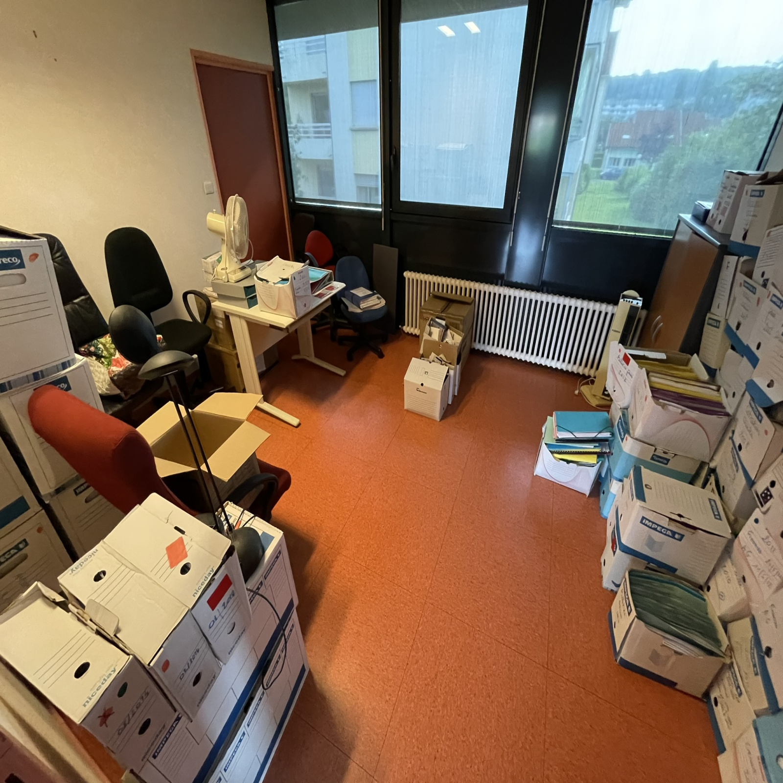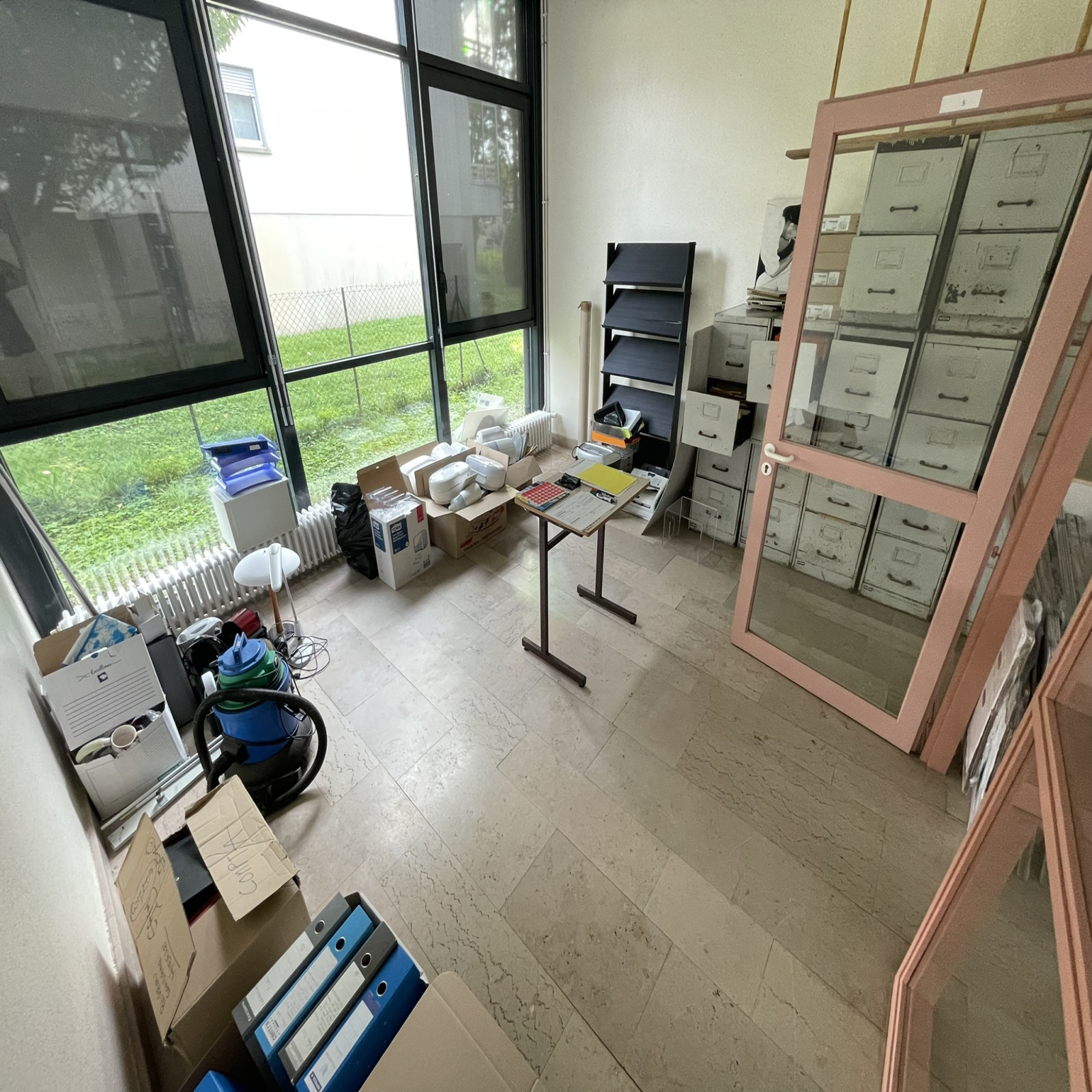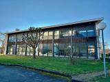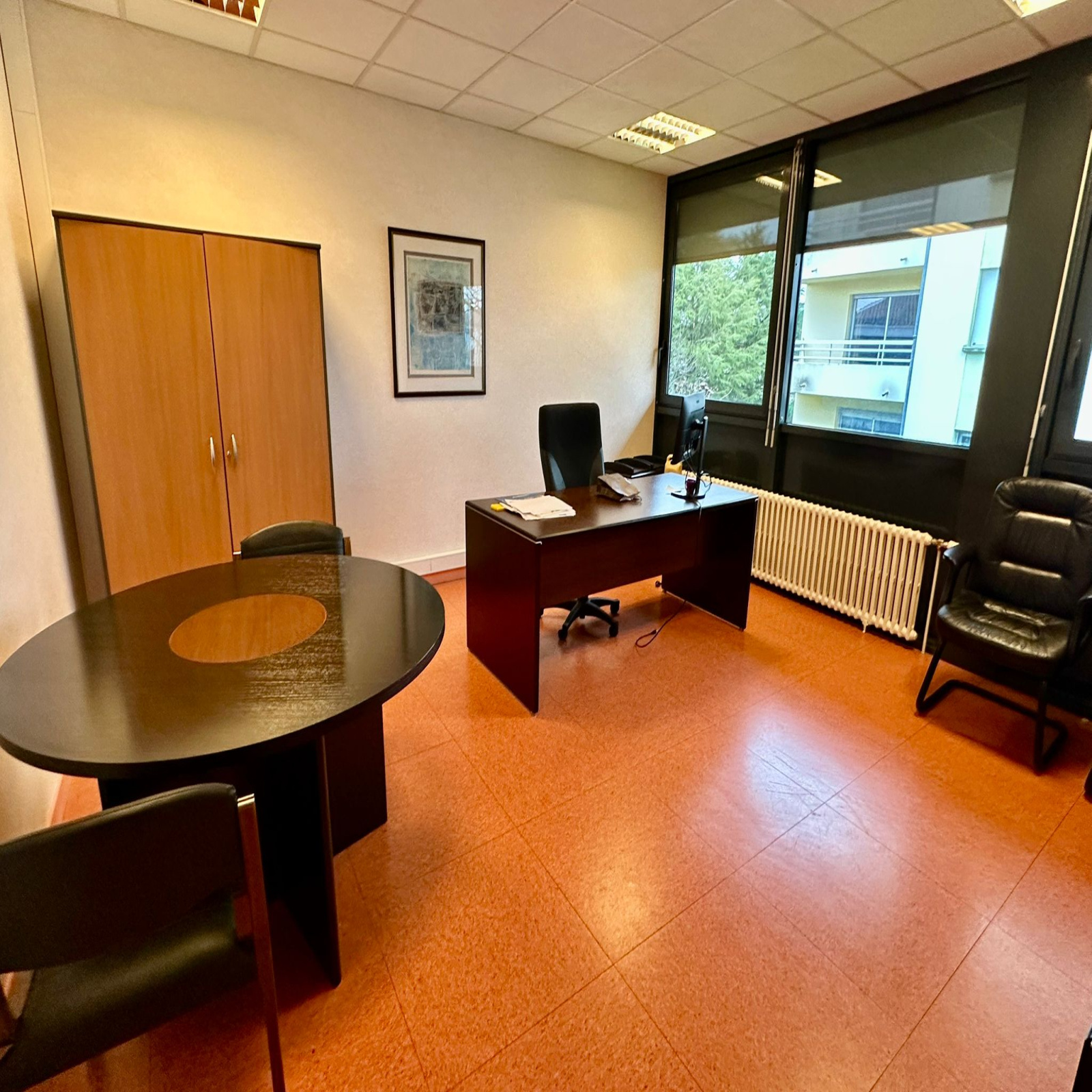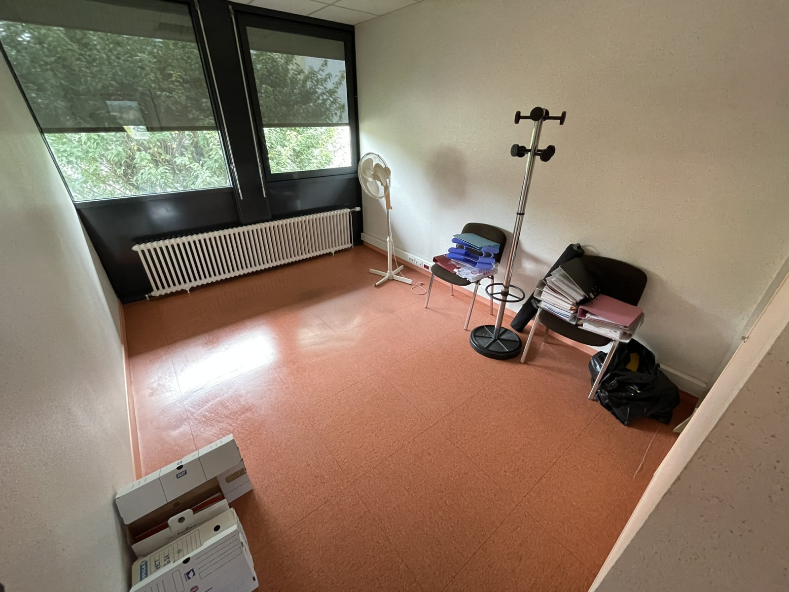 A l'étage : hall (56 m2 env), grand bureau (30 m2 env), 2 bureaux (15 et 20 m2 env), une pièce d'archivage (35 m2 env), local technique informatique avec climatisation, 8 bureaux avec placards (12-13 m2 env), cuisine (15 m2 env), une pièce avec sortie de secours (21 m2 env), sanitaires.