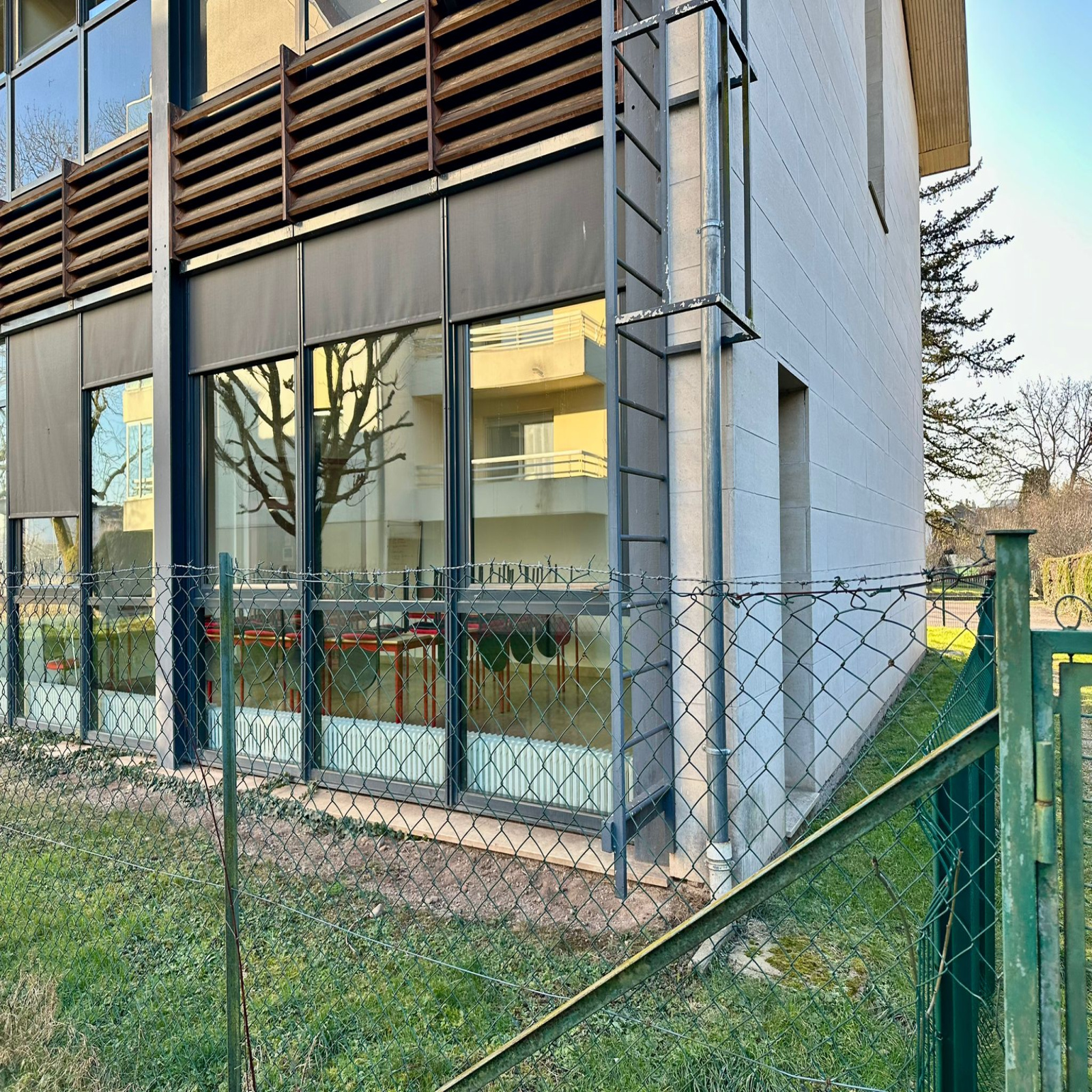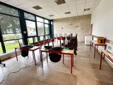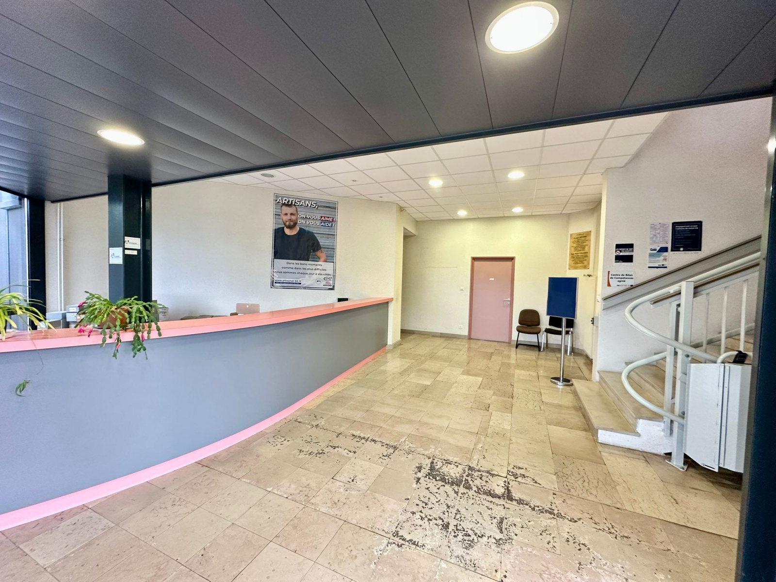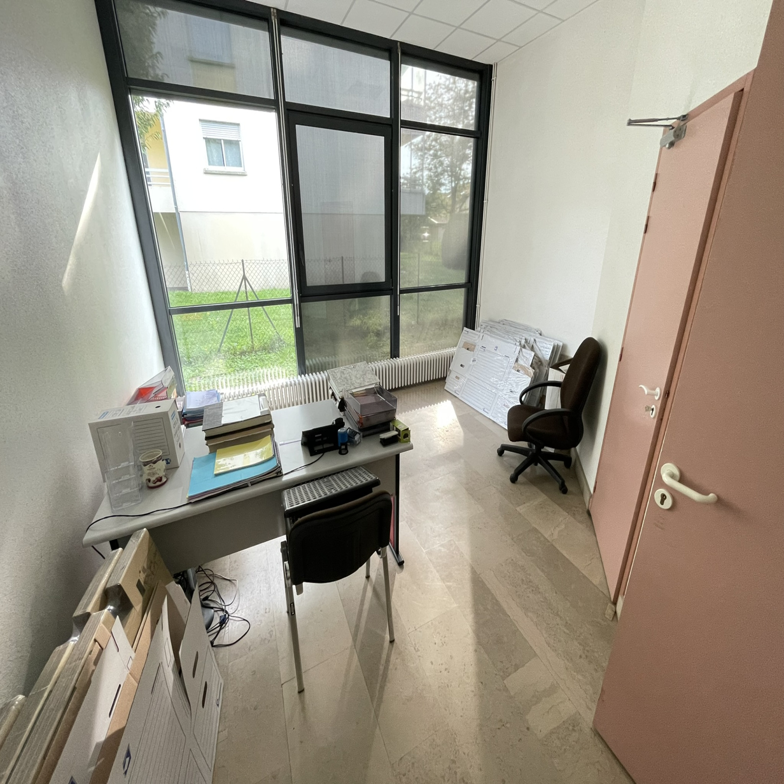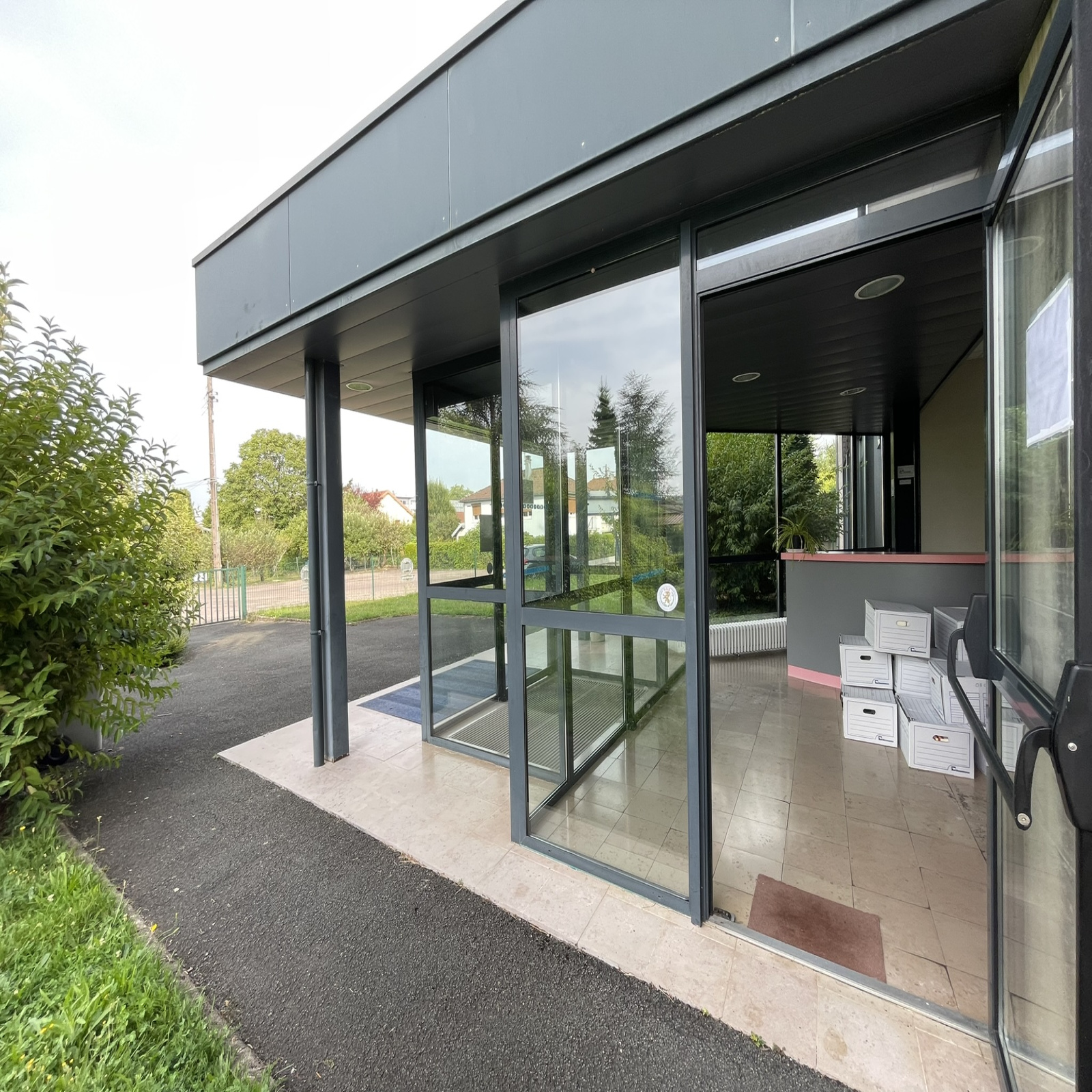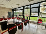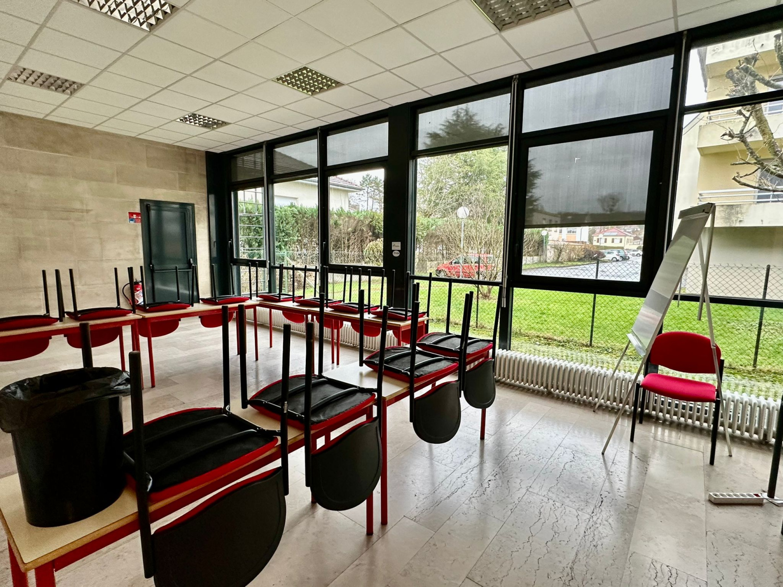 Au rez-de-chaussée : sas, hall d'entrée / acceuil (60 m2 env), remise, sanitaires (hommes, femmes, handicapés), 2 bureaux (20 m2 env) avec remise, une pièce vitrée (17 m2 env), 2 salles de réunion (38 m2 env), salle d'archivage (11 m2 env), local électrique, dégagement.