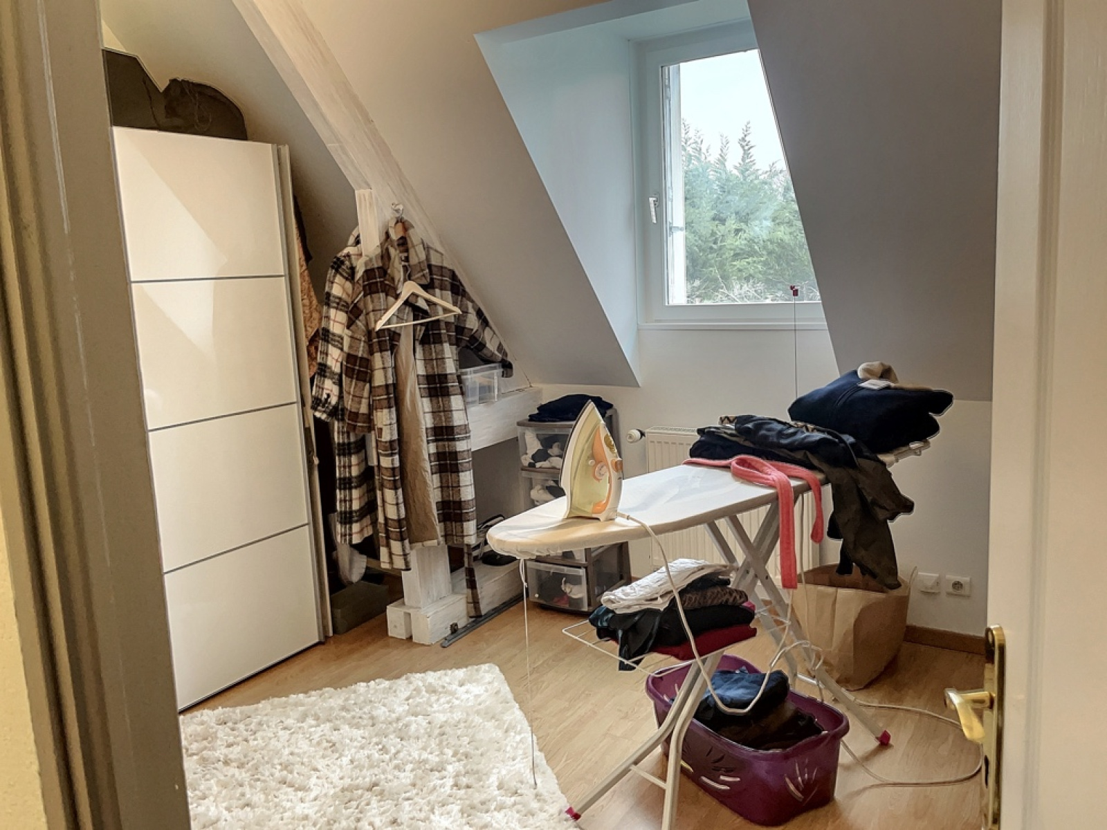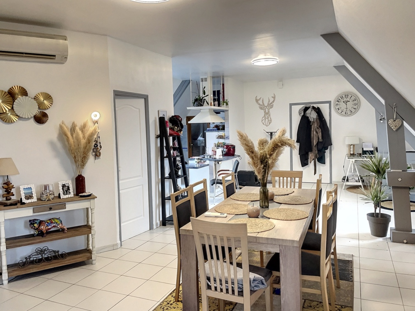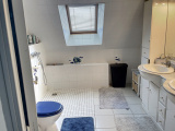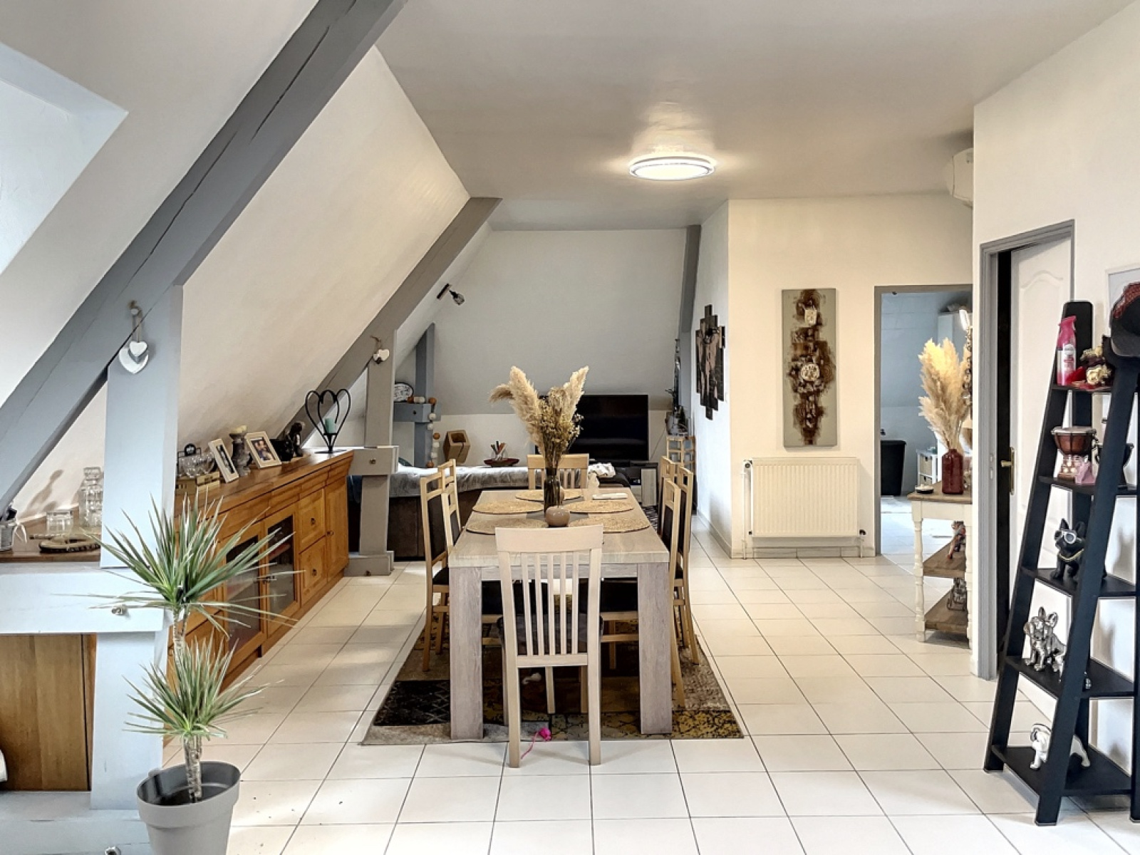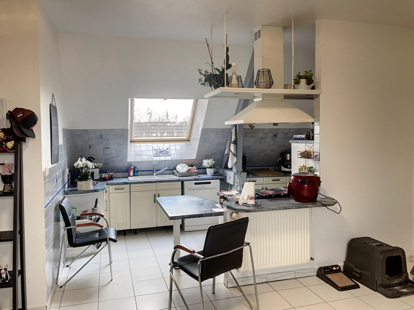 A l'étage : un appartement mansardé à rafraîchir avec entrée (5,8 m2 env), cuisine aménagée ouverte sur salle à manger / salon (48 m2 env), buanderie (3 m2 env), dégagement (9 m2 env), salle d'eau avec wc (6 m2 env), 2 chambres (10 et 10 m2 env), bureau (8 m2 env), une autre pièce (8 m2 env), wc.