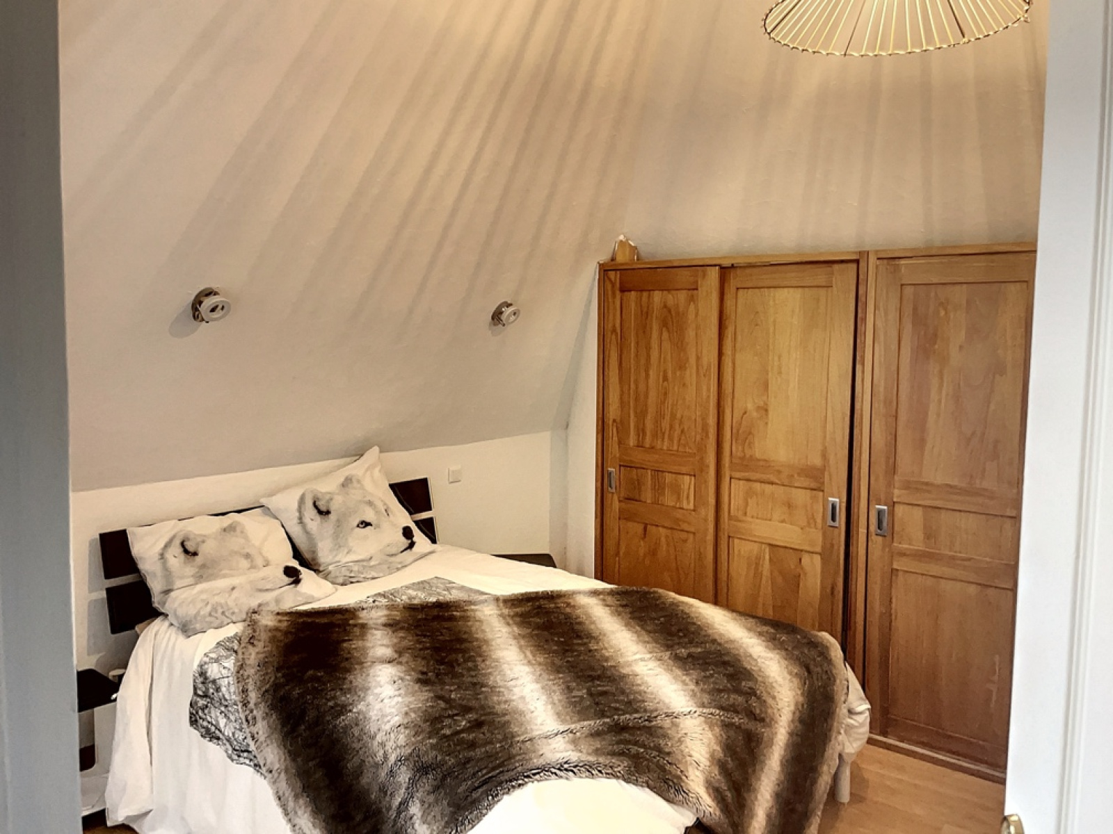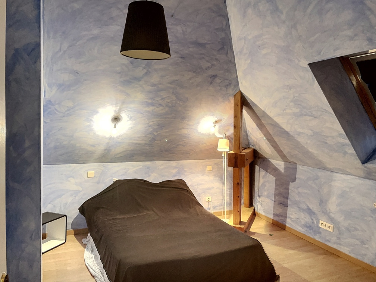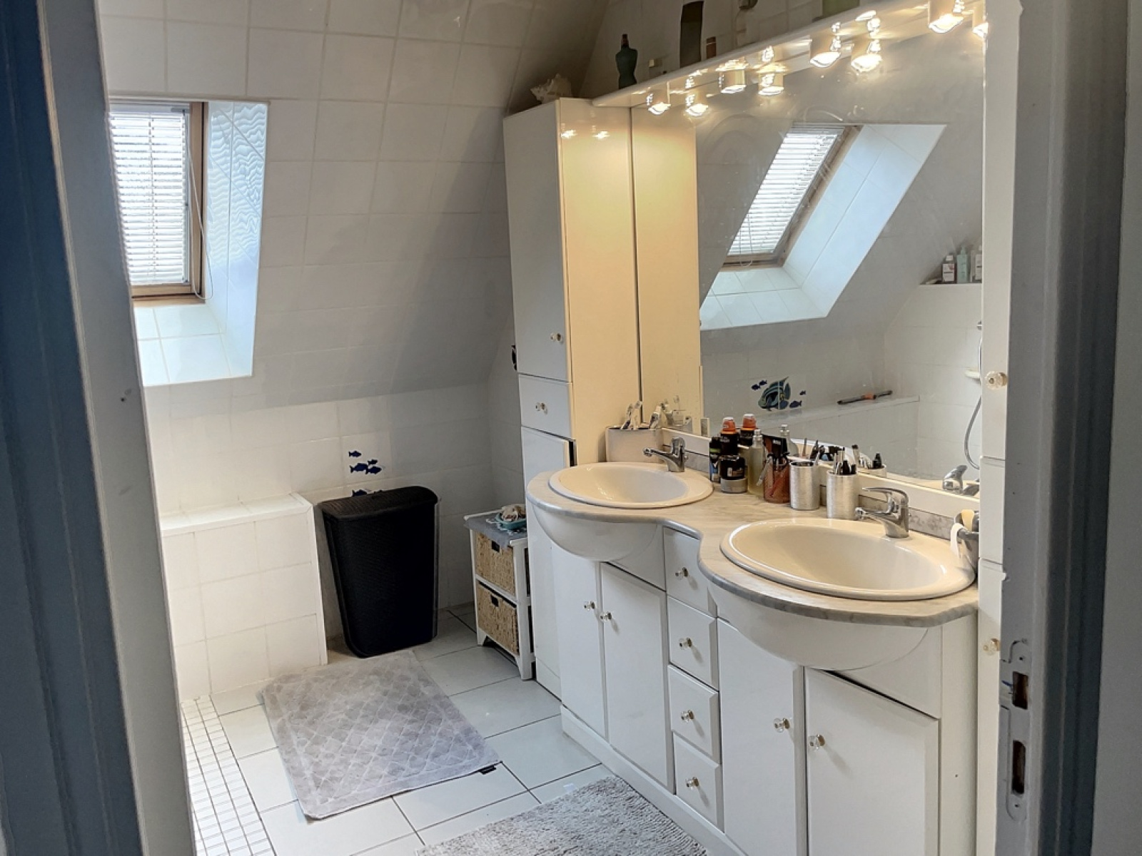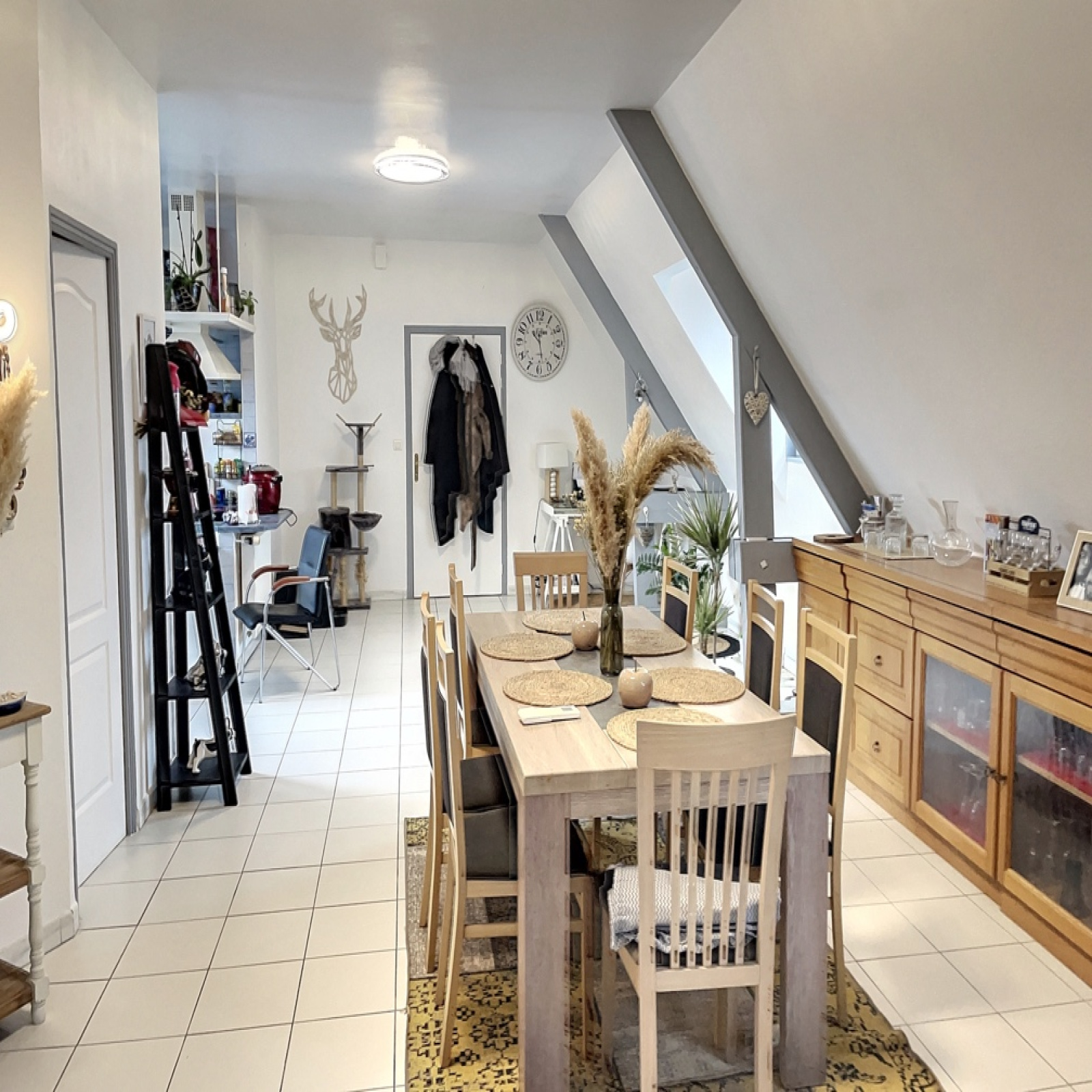 A l'étage : un appartement mansardé à rafraîchir avec entrée (5,8 m2 env), cuisine aménagée ouverte sur salle à manger / salon (48 m2 env), buanderie (3 m2 env), dégagement (9 m2 env), salle d'eau avec wc (6 m2 env), 2 chambres (10 et 10 m2 env), bureau (8 m2 env), une autre pièce (8 m2 env), wc.