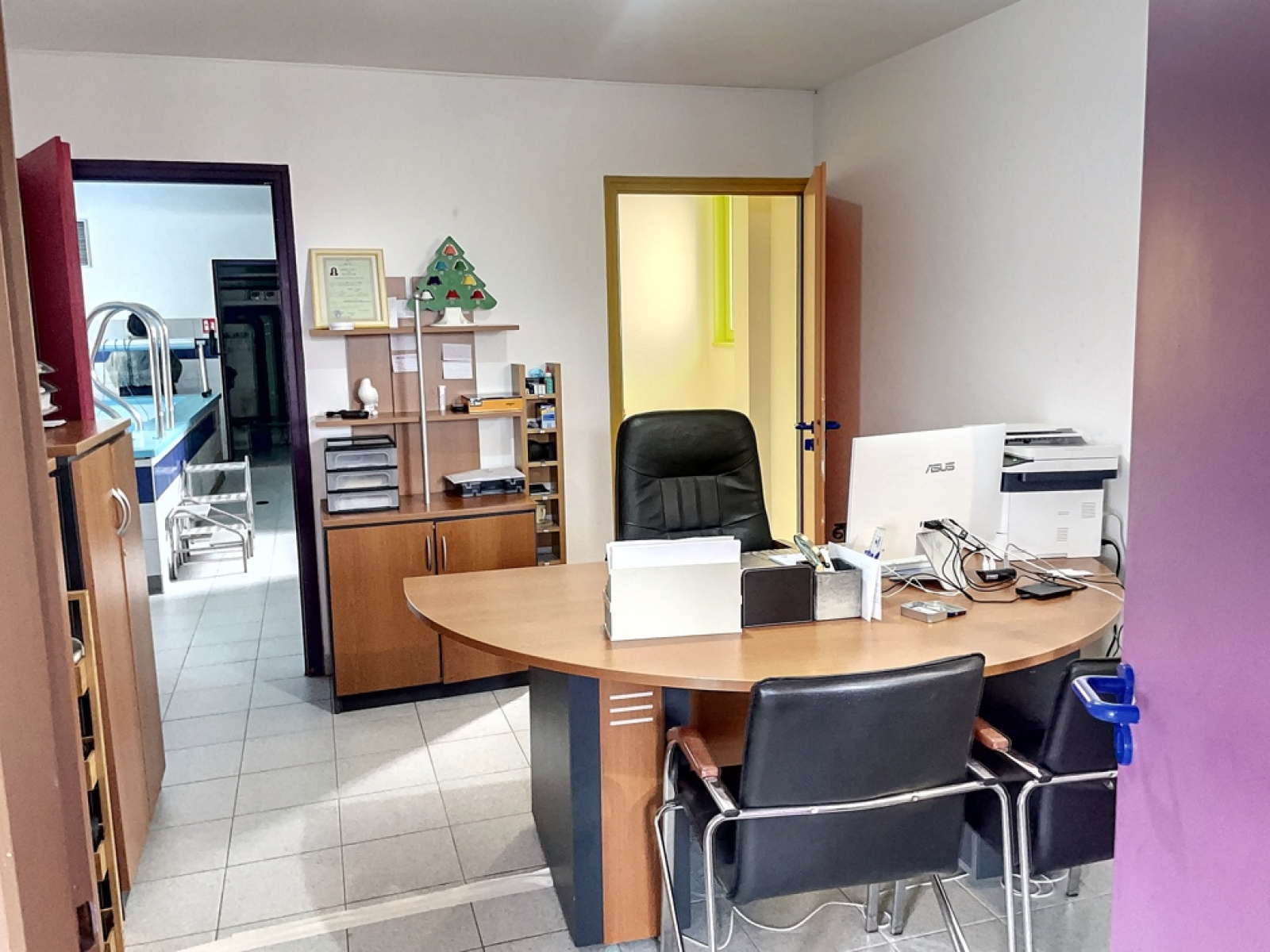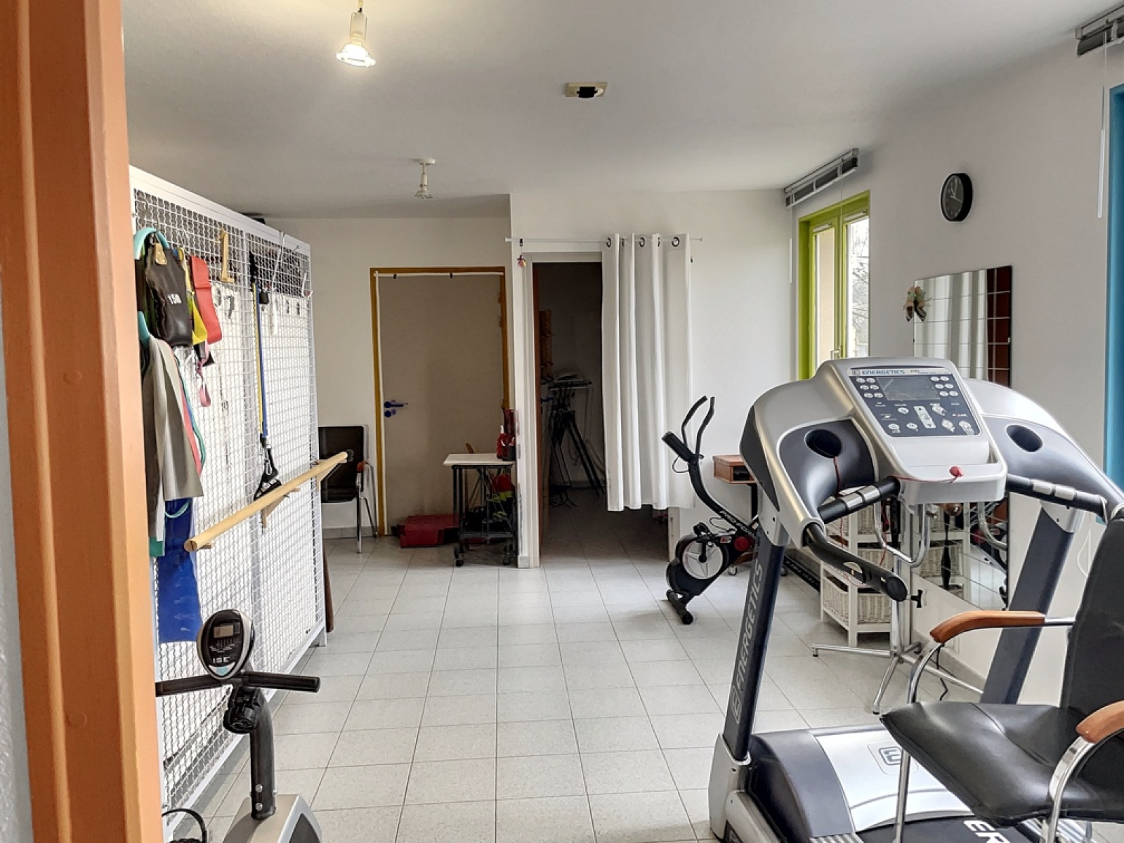 Au rez-de-chaussée : entrée désservant un bureau, une salle de gym et de travail, 2 toilettes, salle UV, salle piscine/balnéo/douche, local technique. Actuellement loué 700 euros / mois par un kinésithérapeute.