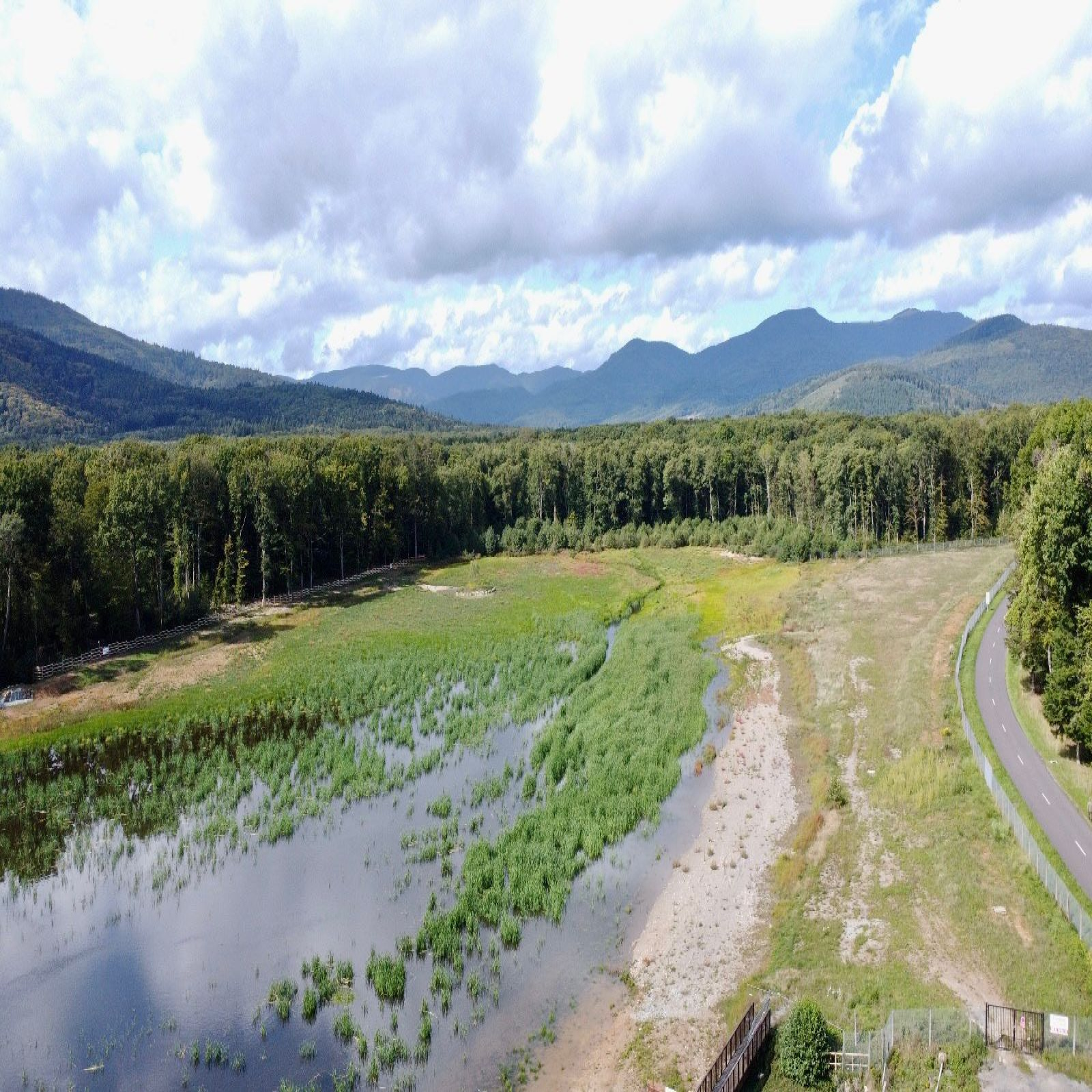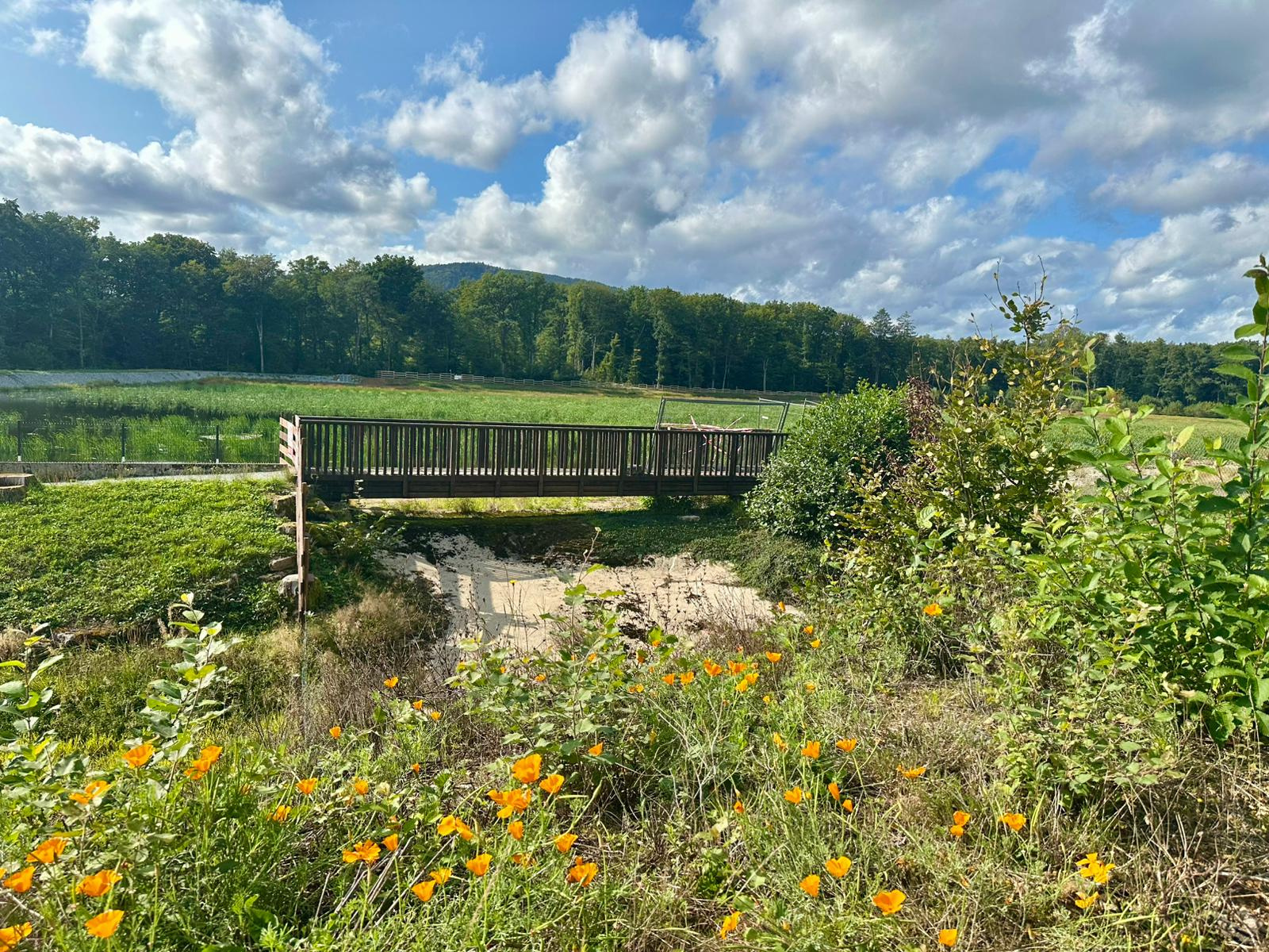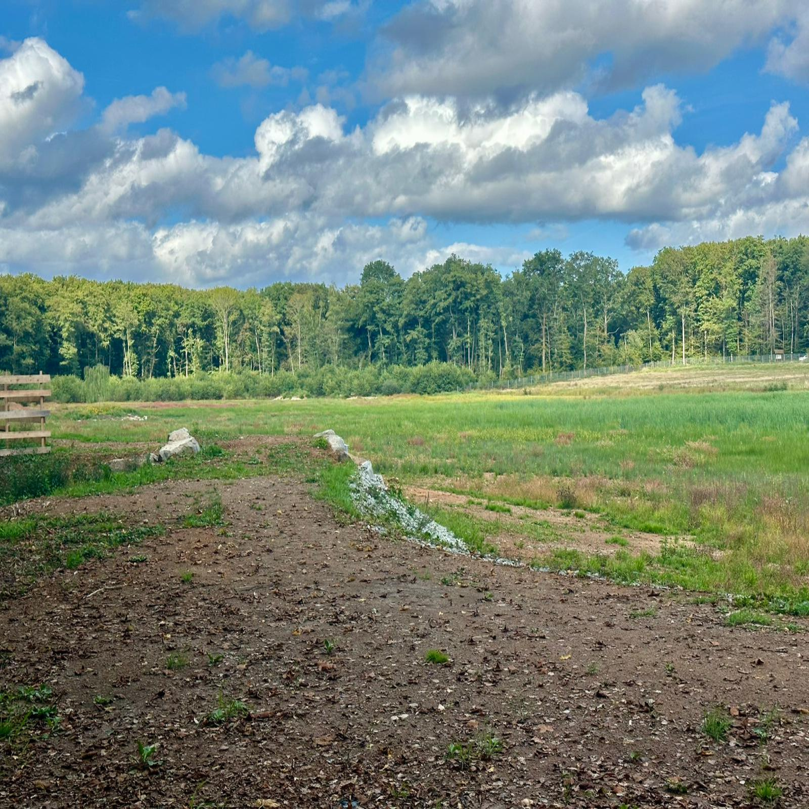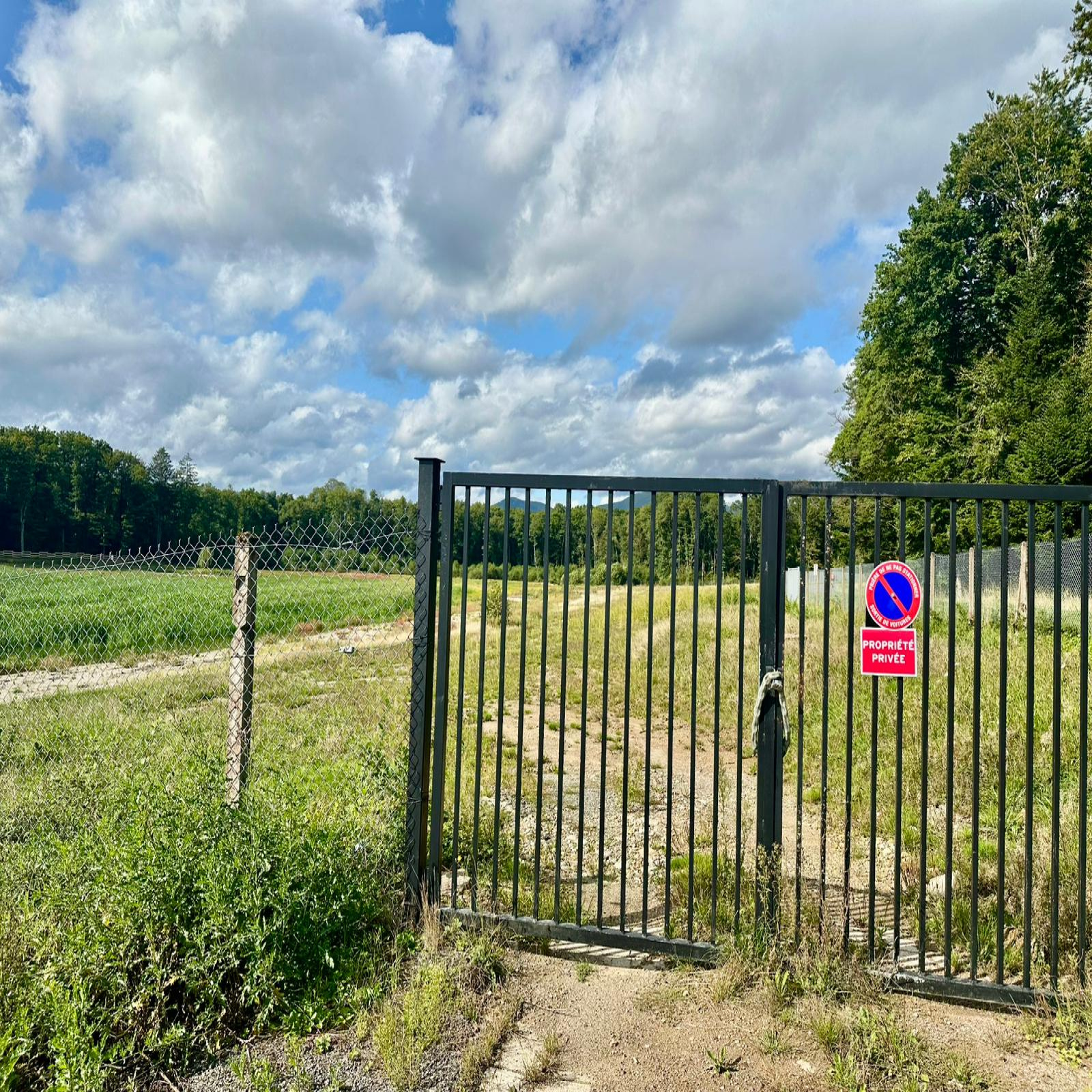 Une bonne partie est clôturée par un grillage inox et piliers béton, le reste ouvert pour zone humide, accès pour les animaux et palissade en bois.