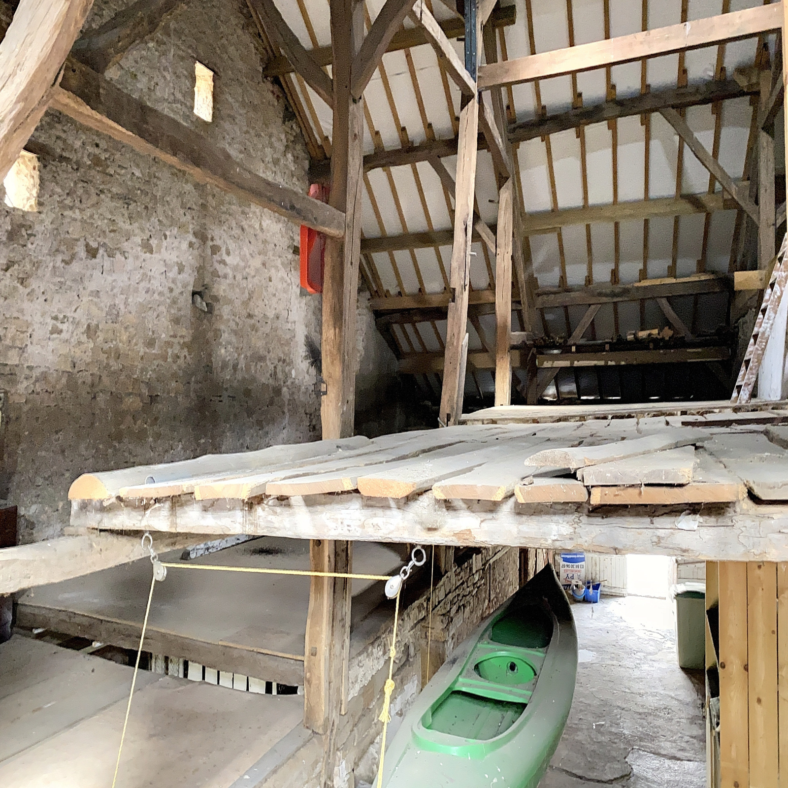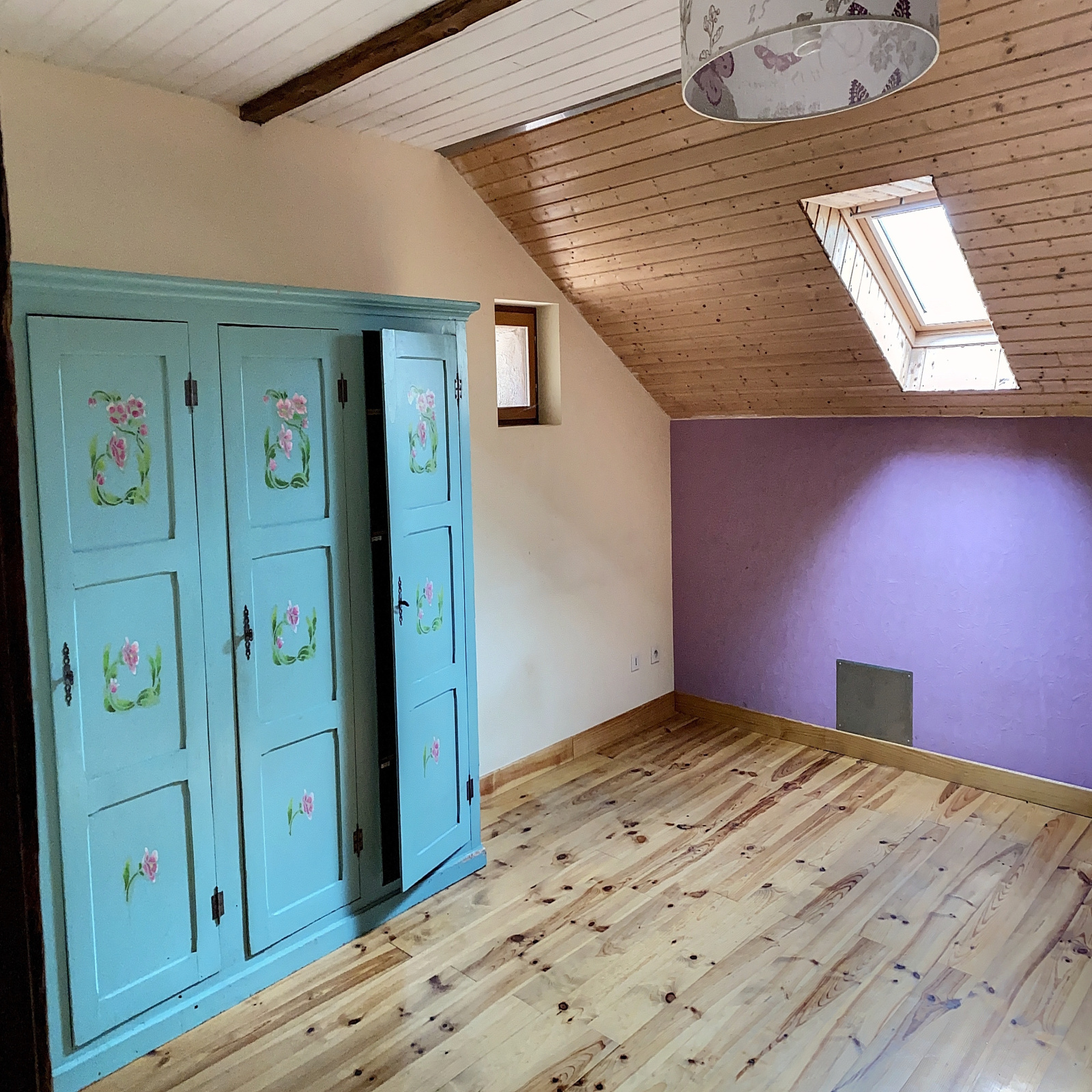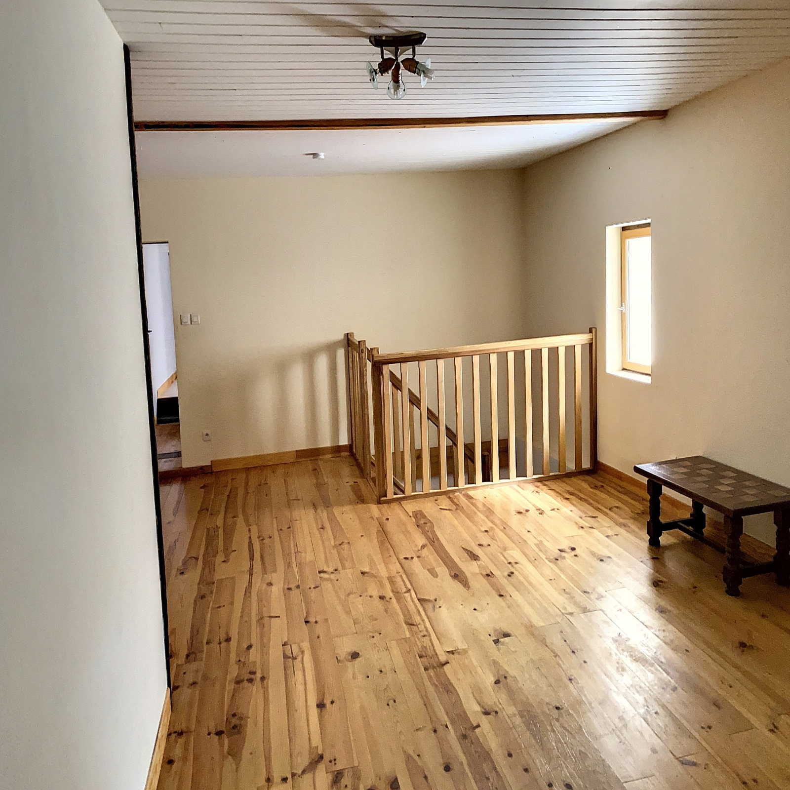 A l’étage : mezzanine de 40 m² env, 2 grandes chambres, cabinet de toilette (wc, lavabo, possibilité douche).